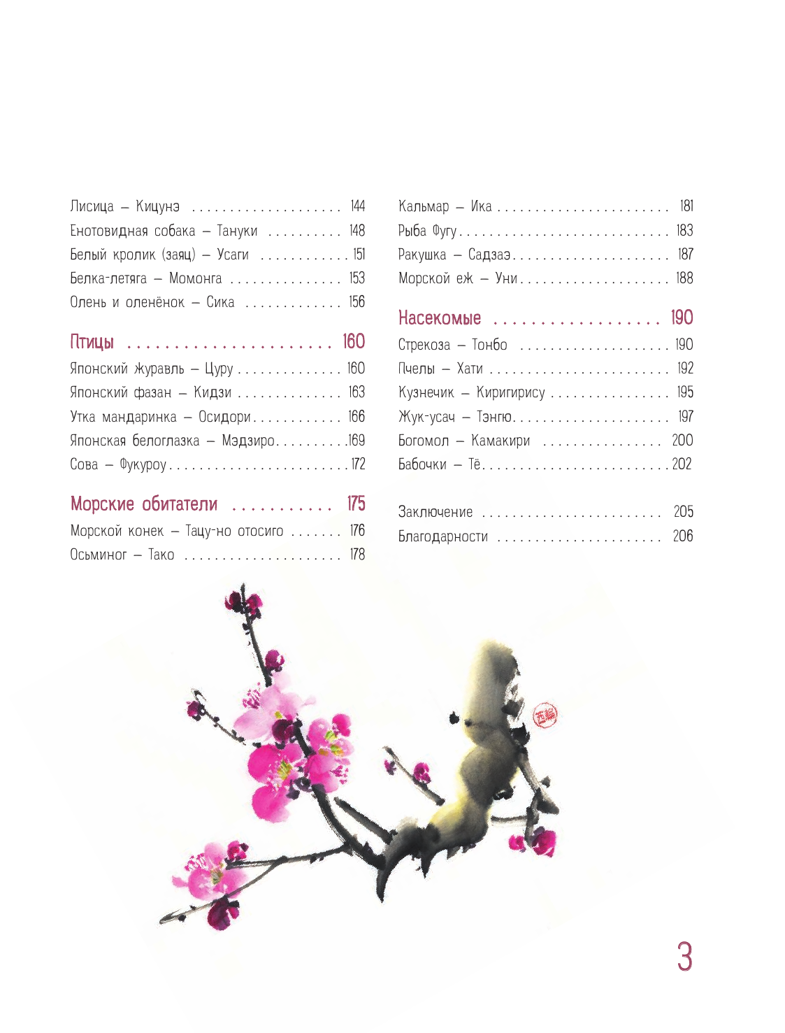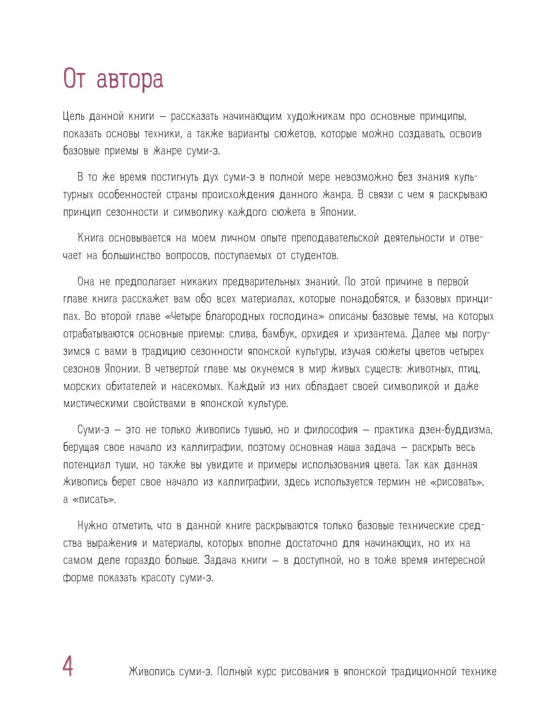Книга для тех, кто хочет научиться изображать животных в японской технике. "Кто хочет писать картины, тот должен строение живых существ сначала понять сердцем, а затем уже копировать кистью". Первоочередным художественным средством выражения в японской живописи суми-э является тушь. Однако если вы любите цвет, вполне допускаются красочные акценты. Традиционно используются минеральные краски.