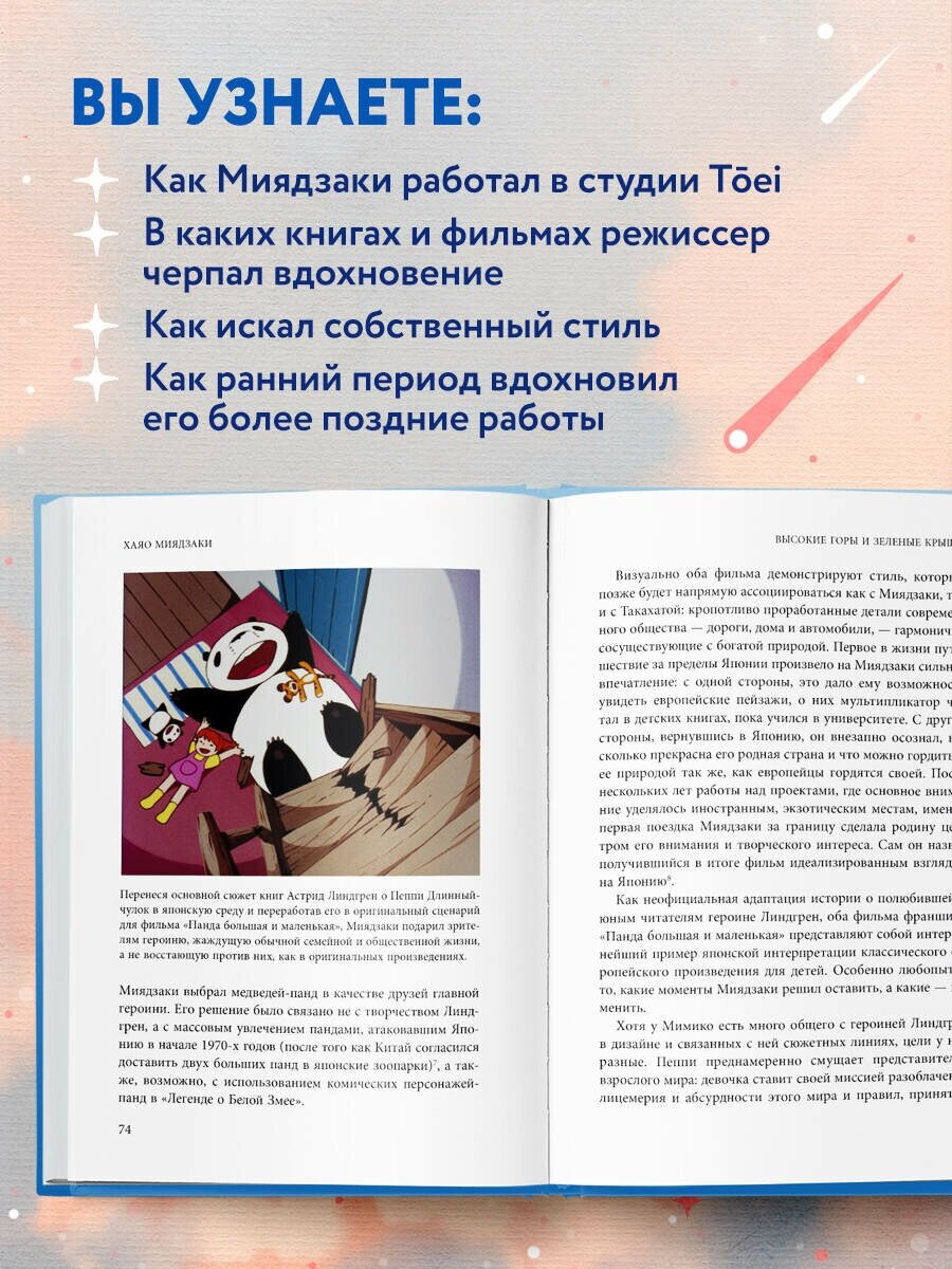 Прочитал с удовольствием данную книгу. В ней автор разбирает ранние произведения (заканчивается на произведении "Ветер крепчает", включительно) Хаяо Миядзаки и рассказывает о том, что повлияло (книги, манга, политический взгляд в его более молодые годы, знакомство с командой других мультипликаторов, в том числе и с Такахатой) и вдохновило его при участии в той или иной работе. Также автор мало-мальски рассказывает о развитии отечественной (японской) и зарубежной анимации в годы становления режиссером Миядзаки и о том, как это на него повлияло. Для меня было интересно узнать что-то новое о данном режиссере, а именно о его становлении как профессионала-мультипликатора. В этом и заключается основная идея книги. Если вы хотите узнать подробности о его биографии (какие-то личные вещи: например, о его жене, детях, когда женился и т.д), то, наверное, будете расстроены, т.к. здесь только основное из его биографии (кто были родители, что ему нравилось в детстве и т.п.). В целом, я рекомендую к прочтению. Немного разочаровало, что автор как-то скудно разобрал некоторые произведения (например, произведение "Ветер крепчает").
