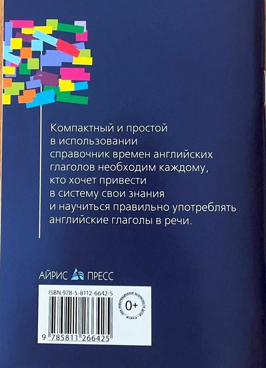 Книга размером с ладонь. Обложка очень мягкая и сильно мнётся. Но при этом цена тоже невысокая. Да и в целом, если смотреть по содержанию, то очень даже ничего. Книга полезная, содержит в себе все времена, а также времена указаны в active and passive voice. Такую книжку можно и с собой взять, и дома хранить. В ней нет новой информации для тех, кто знает времена, но очень удобно держать эту малышку при себе, чтобы если что в неё заглядывать.