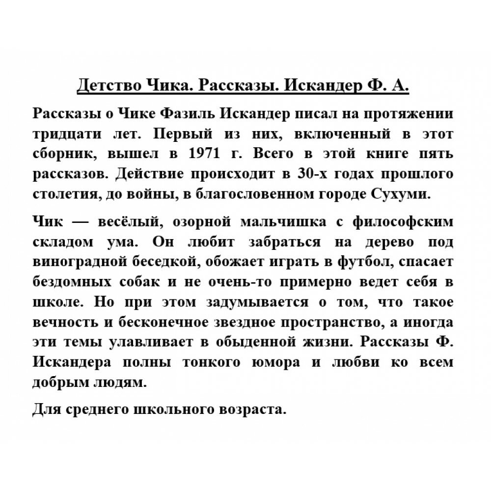На сегодняшний день товар «Книга: Детство Чика. Рассказы (Фазиль Абдулович Искандер); АСТ, 2022» можно купить с кешбеком в 5 магазинах: ЛитРес, Буквоед, book24, Яндекс.Маркет, Читай-город