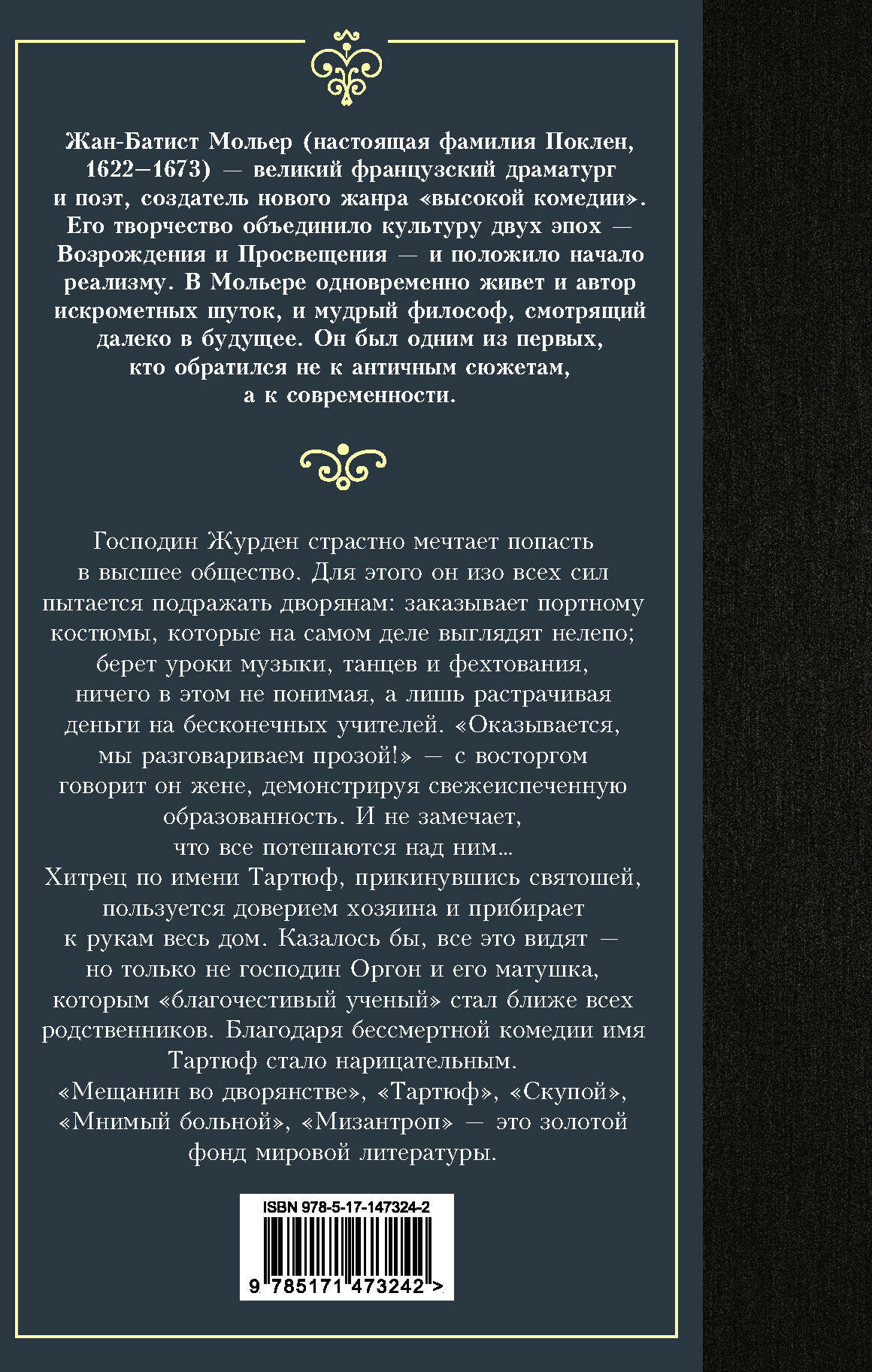 Конечно, эти произведения Жана-Батиста Мольера давно стали классикой, но не потеряли актуальности до сих пор. Тщеславие, глупость, ханжество - эти свойства человеческой натуры, к сожалению, не исчезают со временем. Произведения написанные в 17 веке и сейчас звучат вполне современно. Я конечно читала их и ранее, но брала книгу в библиотеке. А сейчас купила книгу - внуку задали чтение на лето, а в этом издании были все пьесы, которые он должен был прочитать. Спасибо издательству АСТ и Лабиринту. Книга издана вполне прилично, переплет твердый, очень красивый. Вообще книги АСТ из серии "Лучшая мировая классика" очень хорошо оформлены и переплетены. Качество печати хорошее, бумага, правда, дешевая., но не тонкая, качество приемлемое. Иллюстраций нет. Видимо, издательство всеми силами старалось уменьшить себестоимость книги, чтобы сделать ее доступнее для школьников и студентов. И это удалось. Книга очень недорогая, но ее приятно взять в руки и легко читать.