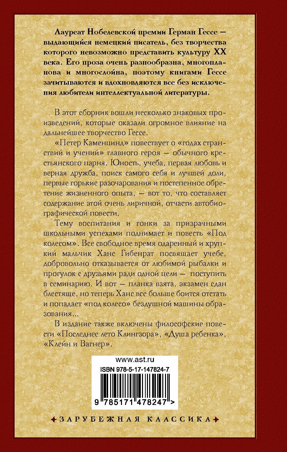В эту книги вошли дебютные произведения нобелевского лауреата Германа Гёссе: романы «Петер Каменцид», «Под колесом», повести «Последнее лето Клингзора», «Душа ребенка», «Клейн и Вагнер».