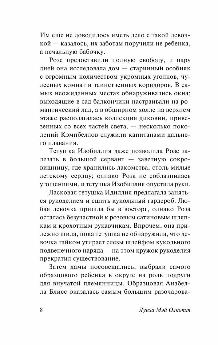 Прочитав около половины, могу судить, что данный роман пободрее и увлекательнее "Маленьких женщин". Конечно, манеры и воспитание того времени никуда не делись. Милой сироте Розе приходися принять на себя все внимание тетушек и кузенов, открыть этот мир заново.