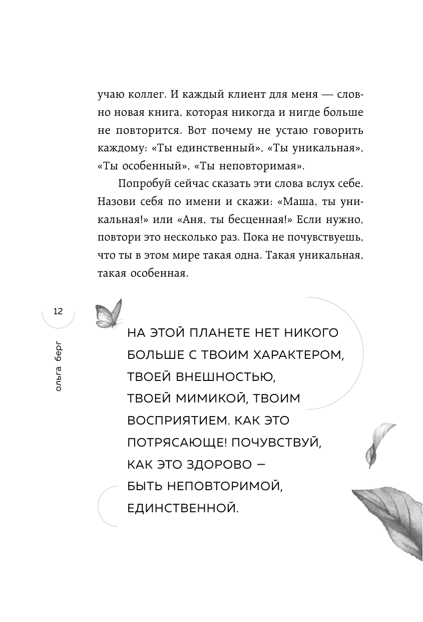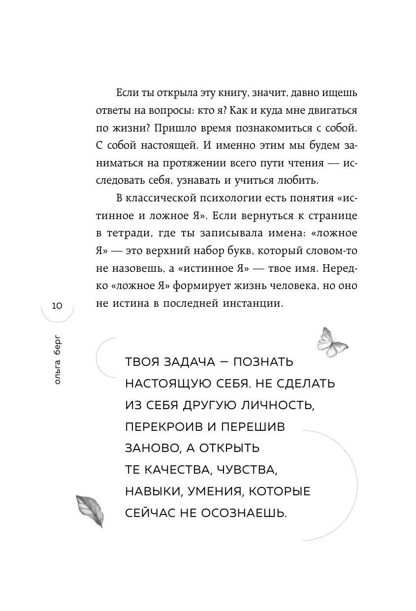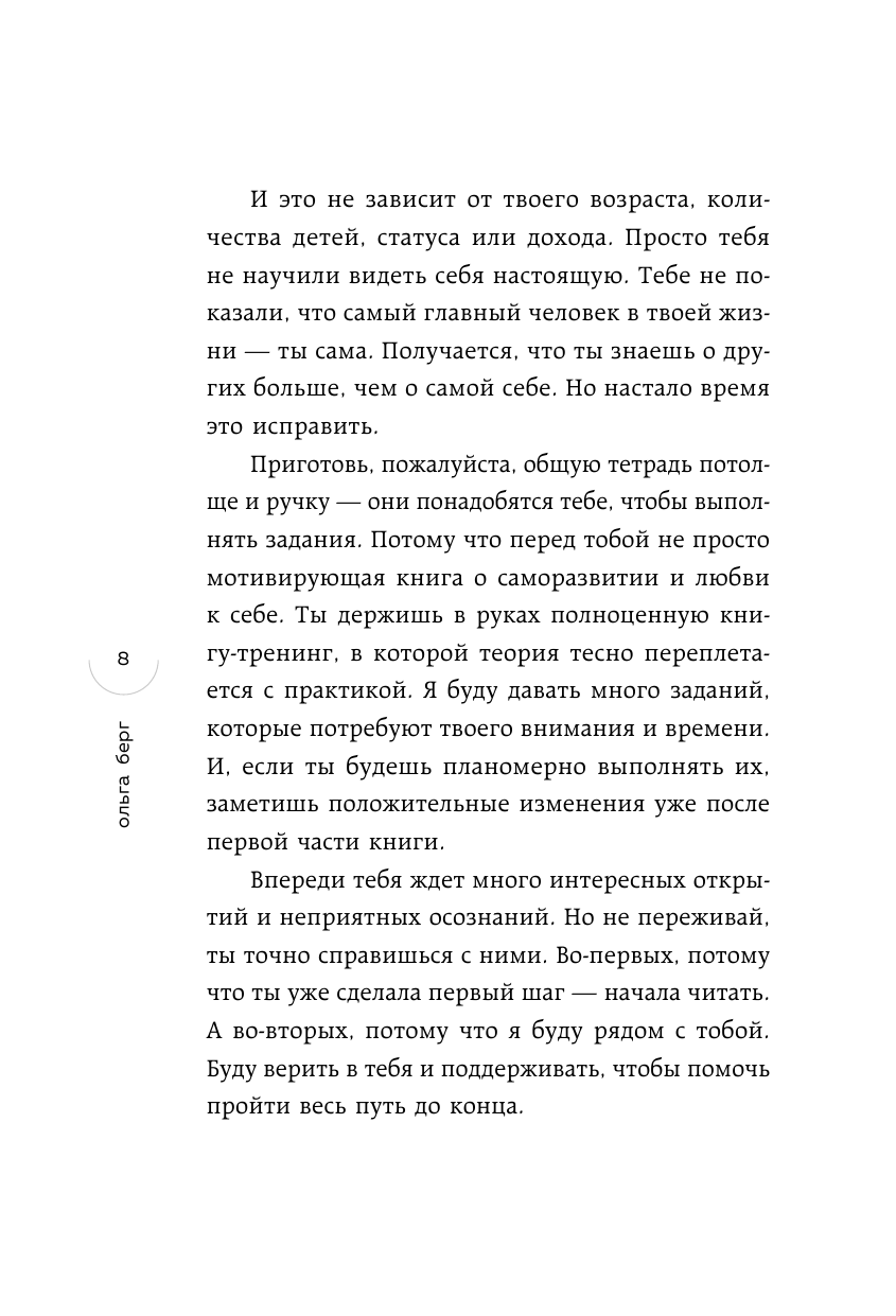 "Невозможно читать эту книгу и не рефлексировать над каждым предложением. Ольга Берг заставляет разобраться с внутренними конфликтами и выставляет наружу даже потаенные частички души". - Татьяна Мужицкая, психолог, автор бестселлеров "Теория невероятности", "Мне все льзя", "Роман с самим собой", "Брать, давать и наслаждаться"