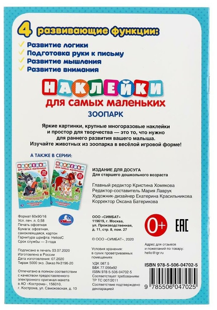 Книга с наклейками для самых маленьких «Зоопарк» ТМ «УМка» станет прекрасным развивающим подарком для ребёнка:25 многоразовых наклеек развивающие задания красочные иллюстрации знакомимся с разными видами животныхЭта обучающая книжка с яркими картинками, крупными наклейками и интересными заданиями в игровой манере познакомит ребёнка с животными, которых можно встретить в зоопарке. Благодаря удобному формату книгу можно взять с собой в дорогу. Книга с наклейками ТМ «УМка» расширяет кругозор и развивает:мелкую моторику сенсорику мышление творческие способности внимание воображение логикуОбъём: 8 стр. Формат: 145 х 210 мм (А5). Материал: бумага офсетная.Рекомендовано детям от 1 года.