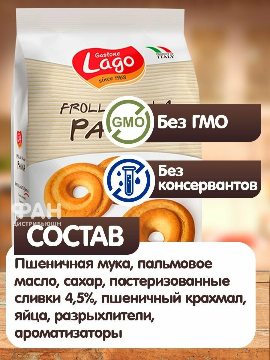 Песочное печенье Gastone Lago Frollini имеет нежный вкус натуральных сливок. Сливочное печенье изготовлено итальянской компанией Gastone Lago, которая является одним из крупнейших европейских производителей кондитерских изделий и радует своими десертами гурманов по всему миру с 1968 года. Gastone Lago использует самые современные технологии и лучшие ингредиенты. Качество печенья со сливками соответствует стандартам IFS, HALAL, KOSHER. Итальянское печенье Gastone Lago не содержит ГМО и консервантов. Песочное печенье имеет насыщенный вкус и аромат и идеально подойдёт в качестве сладкого перекуса, к чаю или кофе и в качестве ингредиента для десертов.