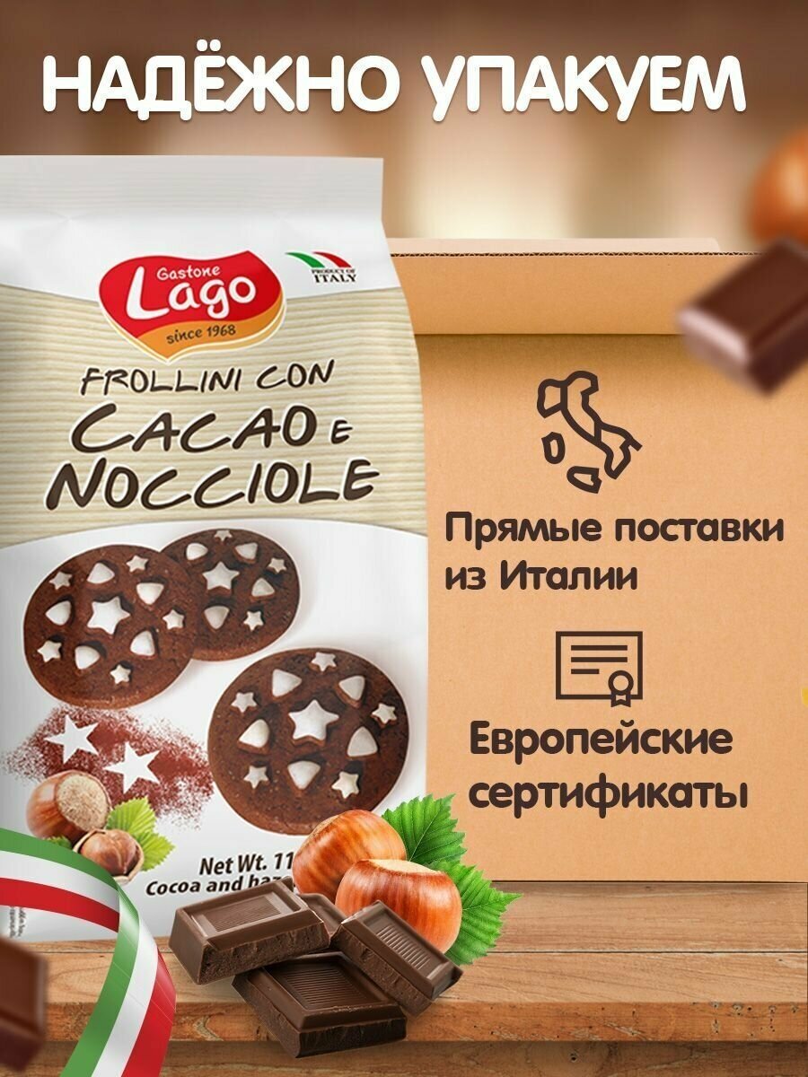 Шоколадное печенье с орехом Frollini изготовлено итальянской компанией Gastone Lago, которая является одним из крупнейших европейских производителей кондитерских изделий и с 1968 года радует своими десертами гурманов по всему миру. Gastone Lago использует самые современные технологии и лучшие ингредиенты. Качество печенья с шоколадом и орехами соответствует стандартам IFS, HALAL, KOSHER. Итальянское шоколадное печенье Gastone Lago не содержит ГМО и консервантов. Сочетание какао, мёда и пасты из лесного ореха придаёт печенью изысканный и неповторимый вкус. Песочное печенье с фундуком имеет идеально подойдёт в качестве сладкого перекуса, к чаю или кофе и в качестве ингредиента для десертов.