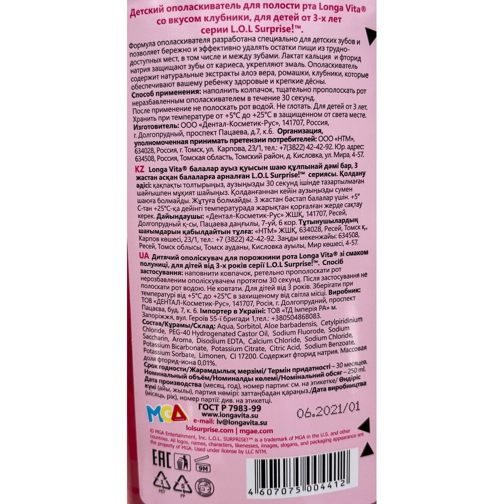 Сервис сравнения цен СкидкаГИД предлагает сравнить цены на товар «Ополаскиватель для рта Longa Vita L.O.L Surprise! детский со вкусом клубники 250мл»