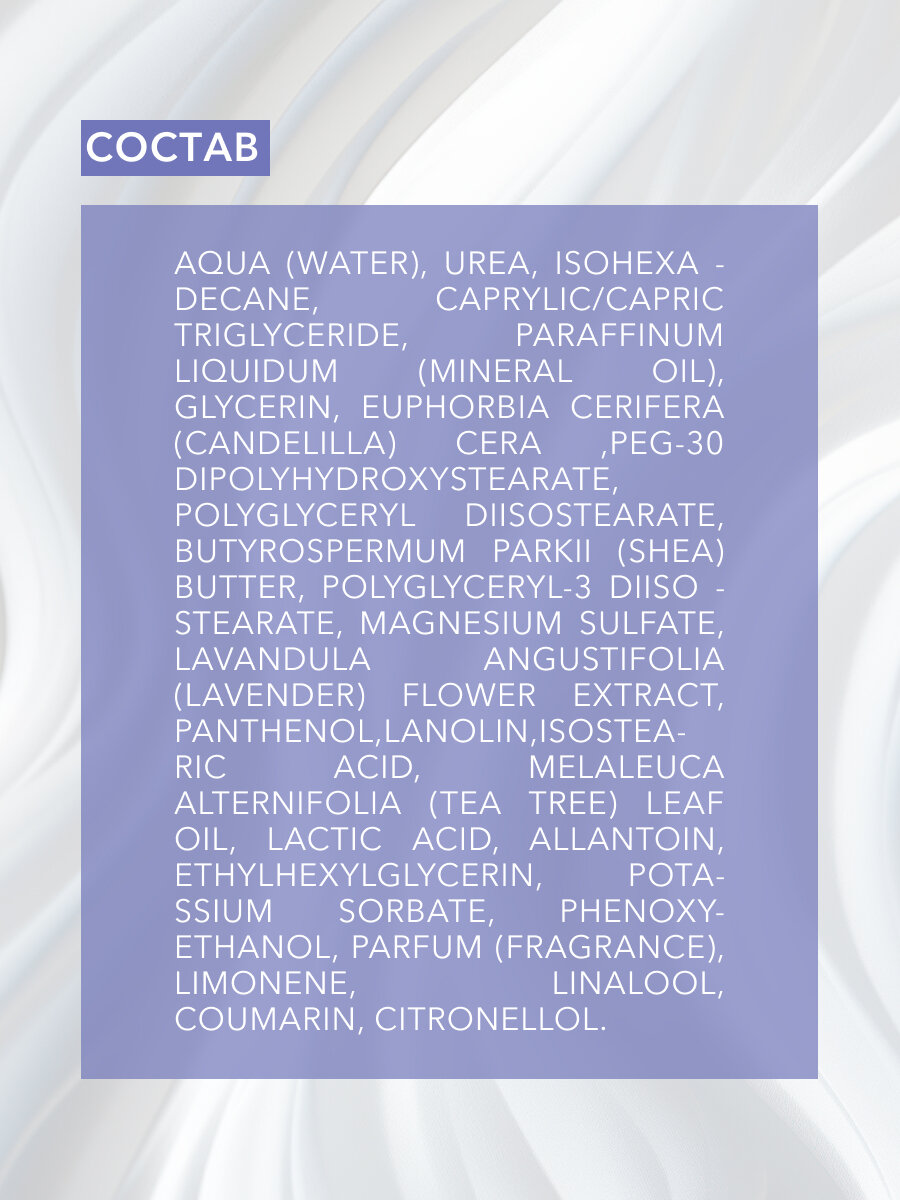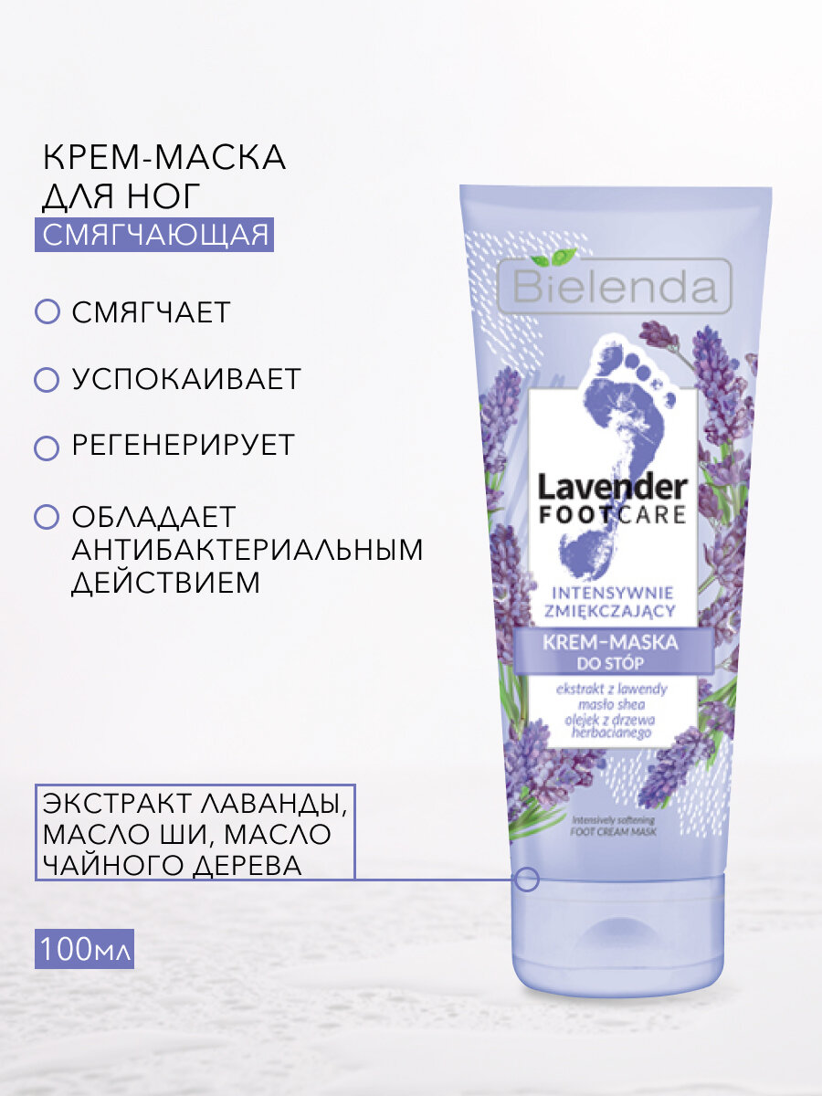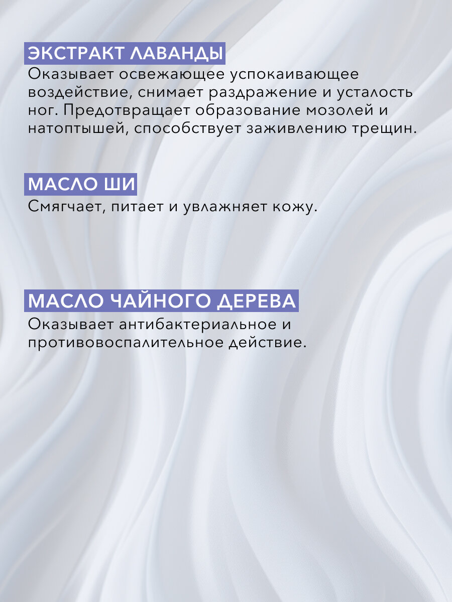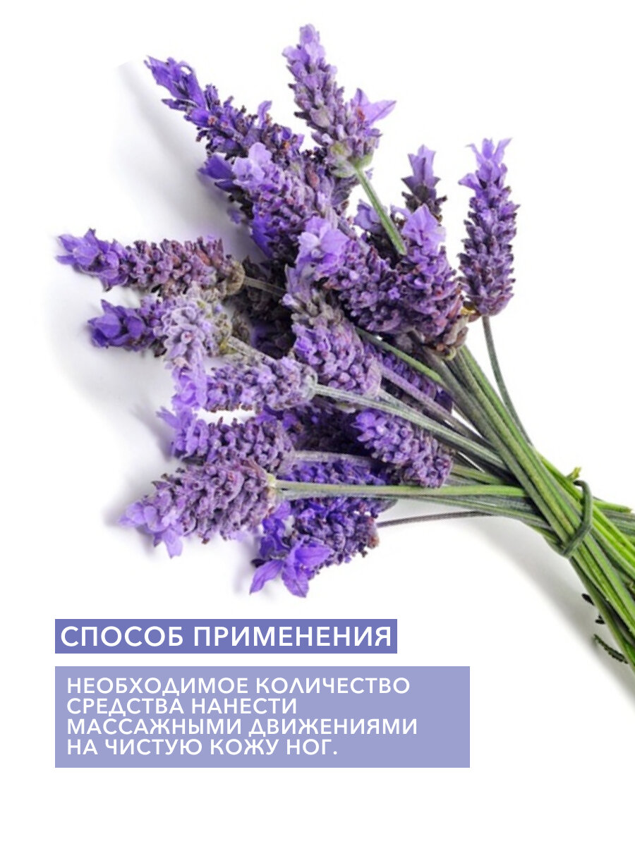 Крем - маска для ног с интенсивно смягчающим действием обладает насыщенной текстурой, которая быстро впитывается и улучшает состояние кожи стоп. Эффективно регенерирует и успокаивает кожу, дарит ощущение комфорта. Основные ингредиенты: восстанавливающий экстракт лаванды, увлажняющее масло ши и антибактериальное чайное масло. Способ применения: необходимое количество средства нанести массажными движениями на чистую кожу ног.