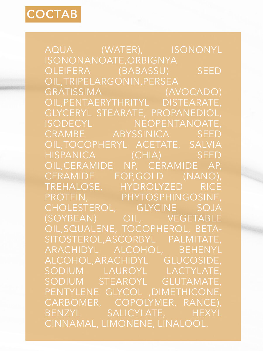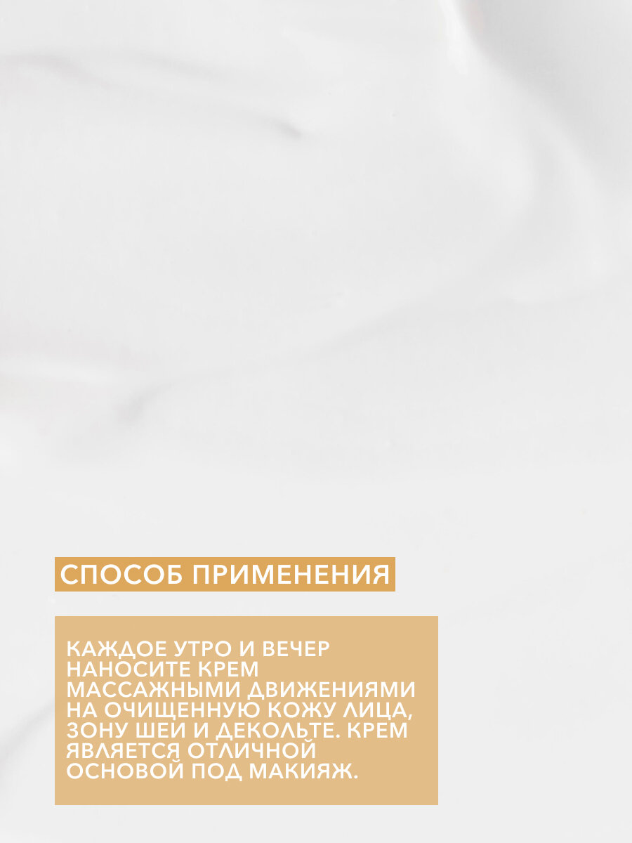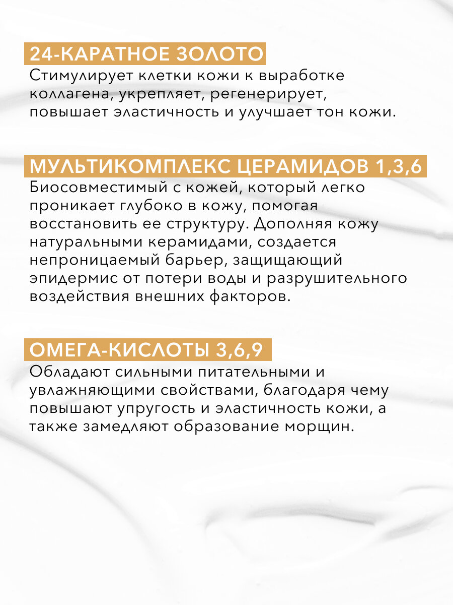 Крем подтягивает и разглаживает кожу. Уменьшает видимость морщин, увлажняет, эффективно регенерирует, повышает упругость и эластичность эпидермиса. Церамиды 1,3,6, содержащиеся в креме, совместимы с кожей, легко проникают в неё, способствуя восстановлению ее структуры. Крем восстанавливает естественный баланс церамидов в коже, предотвращает сухость кожи, сокращая потерю влаги за счет укрепления защитного барьера. 24 CARAT GOLD стимулирует клетки кожи к выработке коллагена, укрепляет, регенерирует, повышает эластичность и упругость кожи, улучшает тон кожи и придаёт сияние. Омега кислоты 3,6,9 обладают питательными и увлажняющими свойствами, благодаря которым они повышают упругость и эластичность кожи, замедляют образование морщин. Способ применения: Каждое утро и вечер наносите крем массирующими движениями на очищенную кожу лица, зону шеи и декольте. Крем является отличной основой под макияж.