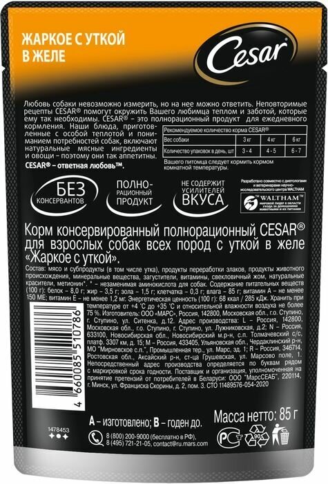 Набор сбалансированных кормов Cesar для собак. Набор состоит из 42 упаковок влажного консервированного корма по 85г в одном пакетике. Всего в наборе 3 варианта вкуса и 2 варианта текстуры:Первый вариант - 14 упаковок со вкусом ""говядина с овощами"" в текстуре ломтики в соусе. Второй вариант - 14 упаковок со вкусом "ягненок с овощами" в текстуре ломтики в соусе. Третий вариант - 14 упаковок со вкусом "жаркое с уткой " в текстуре желе Аппетитные блюда CESAR® – это вкусные, сбалансированные рационы для собак, которые помогут окружить вашего любимца заботой и вниманием. Рационы готовятся по уникальной рецептуре, в состав входят натуральные ингредиенты: они не содержат искусственных красителей, усилителей вкуса и консервантов. Блюда CESAR® обязательно придутся по вкусу вашему любимцу. Хранить при температуре от + 4*С до + 35*С и относительной влажности воздуха не более 75 %