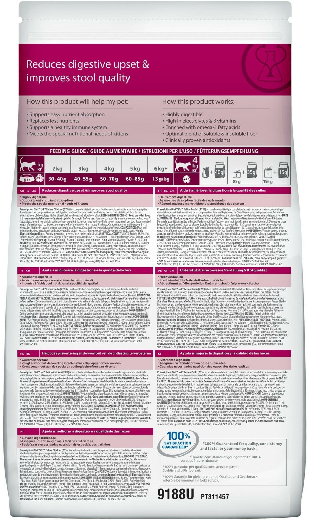 Hill’s™ Prescription Diet™ Feline i/d™ — высоко усваиваемый рацион, созданный специально для поддержания здоровья кошек с расстройствами пищеварения. - Помогает нейтрализовать действие свободных радикалов за счет высокого содержания антиоксидантов. - Обеспечивает великолепный вкус и возможность использования сухого и консервированного рционов для смешанного питания. Рекомендуемая продолжительность диетотерапии: 1-2 недели при острой диареи и в период восстановления; для компенсации дефицита нутриентов - 3-12 недель, в случаях хронической недостаточности поджелудочной железы - пожизненно Пробуете этот рацион впервые? Постепенно в течение 7 дней переводите животное на новый рацион, увеличивая его содержание по отношению к прежнему. Обеспечьте питомцу свободный доступ к свежей воде. Монодиета. Не требует дополнений. Перед началом и о длительности применения проконсультируйтесь с ветеринарным специалистом. Суточная норма кормления указана на упаковке и должна быть расчитана в соответствии с размером животного