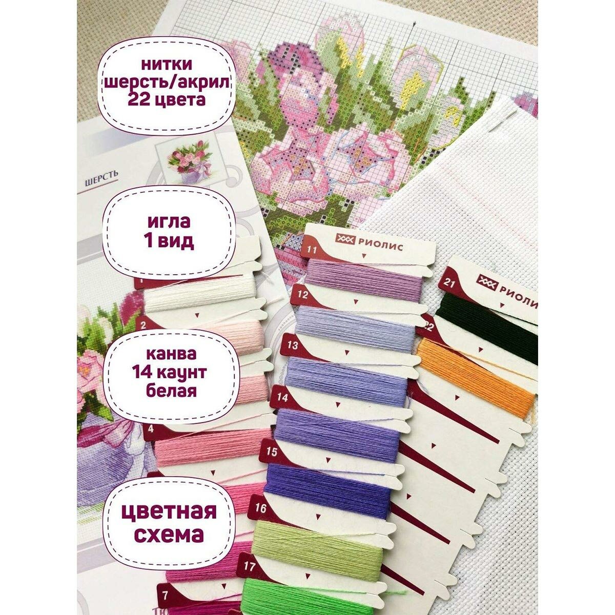 | В набор входит | 14 Aida Zweigart белая, мулине шерсть/акрил (22 цветов), игла, цветная символьная схема и инструкция |