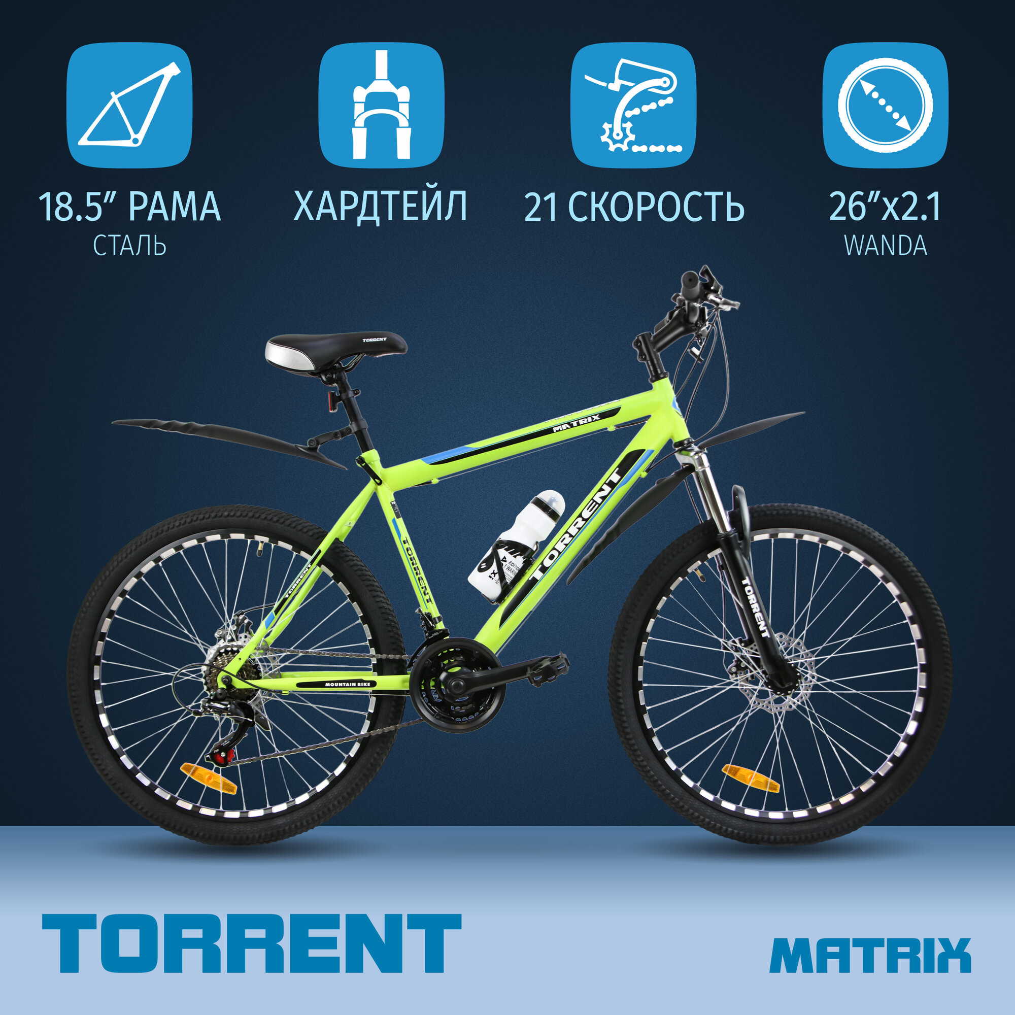 Велосипед TORRENT предназначен для подростков и взрослых с ростом до 163-179 сантиметров. Подходит для езды по выделенным городским велодорожкам, пересеченной местности, а также сельских и загородных прогулок. Рама модернизированная классическая стальная. Велосипед имеет такую конструкцию, которая позволяет перемещаться по дорогам со сложным рельефом (ямы, горки, пологие спуски). Комфортность езды достигается за счет гашения передним мощным амортизатором толчков и вибраций, образующихся при столкновении колес с препятствием. Ободья колёс двойные усиленные декорированные в черный цвет. Шины с оптимальным рисунком протектора, адаптированным для езды по грунтовым дорогам и дорогам с твёрдым покрытием. Размер шин 26Х2,125. Ширина руля из алюминиевого сплава 61 см. Триггеры переключения и переключатели SHIMANO. Дисковые тормоза обеспечивают надежное торможение. Сиденье средней мягкости для придания спортивного стиля велосипеду регулируется по высоте. Фиксация высоты сиденья происходит с помощью ручного зажима «Quick release». Длина подседельного штыря позволяет регулировать высоту сиденья до 21 сантиметра. Велосипед оборудован светоотражателями, боковым центральным упором для парковки, пластиковыми стильными крыльями, бутылкой для воды, а также велокомпьютером, который позволит вам замерить скорость движения, километраж, время поездки и т. д.