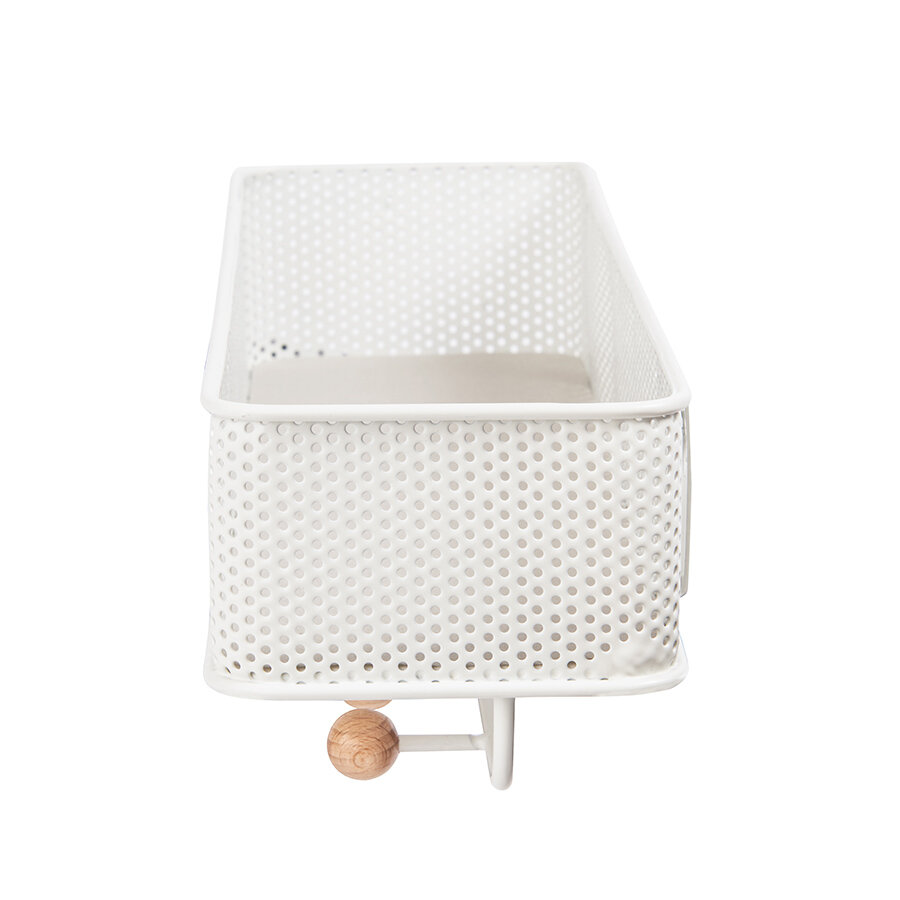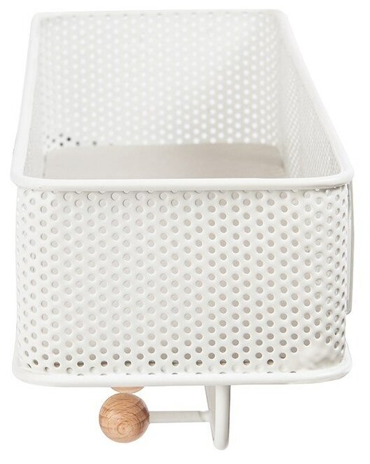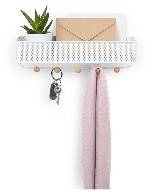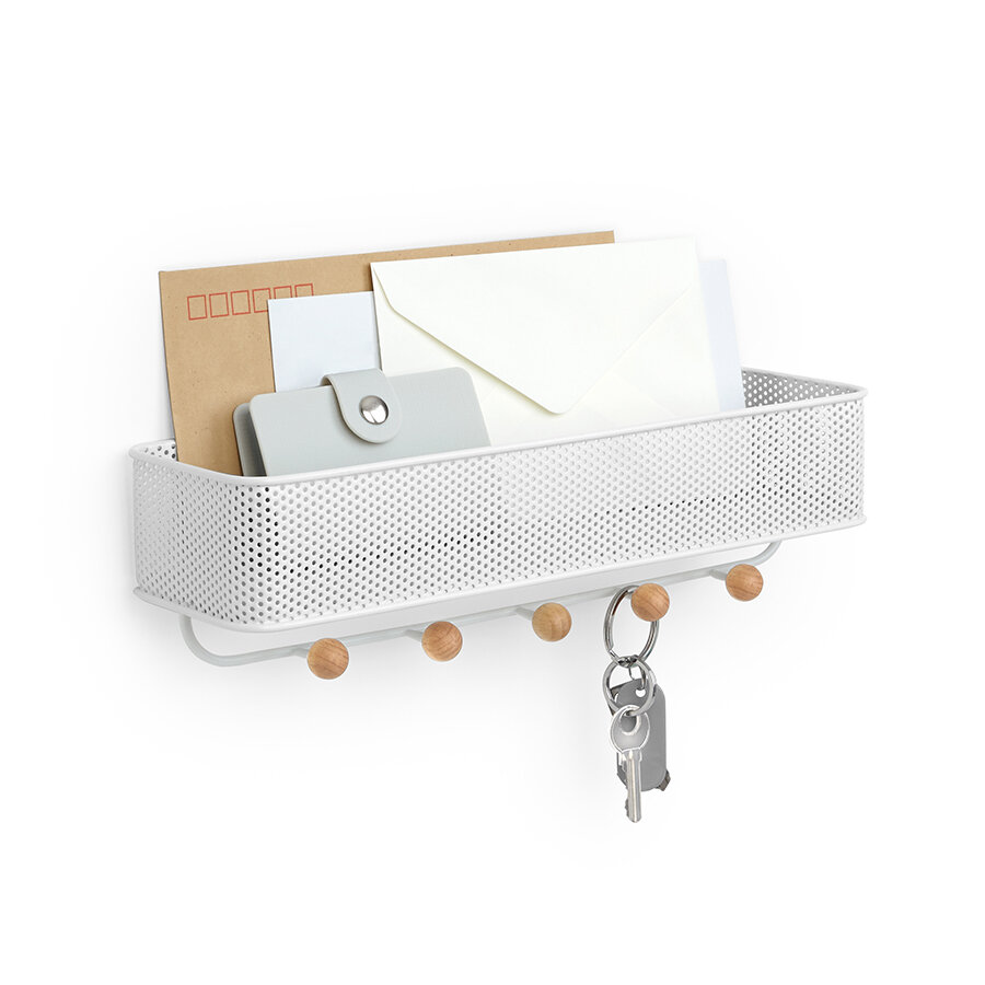 Органайзер обеспечивает дополнительное место для хранения и пркрасно подходит для хранения писем, телефонов, квитанций или портмоне – тех мелочей, которые достаются из карманов и сумок по приходе домой и норовят потеряться.Настенный органайзер выполнен из перфорированного металла и натурального дерева. Пять крючков с круглыми деревянными наконечниками подойдут для ключей и аксессуаров. Сочетается по стилю с предметами из коллекции Promenade.