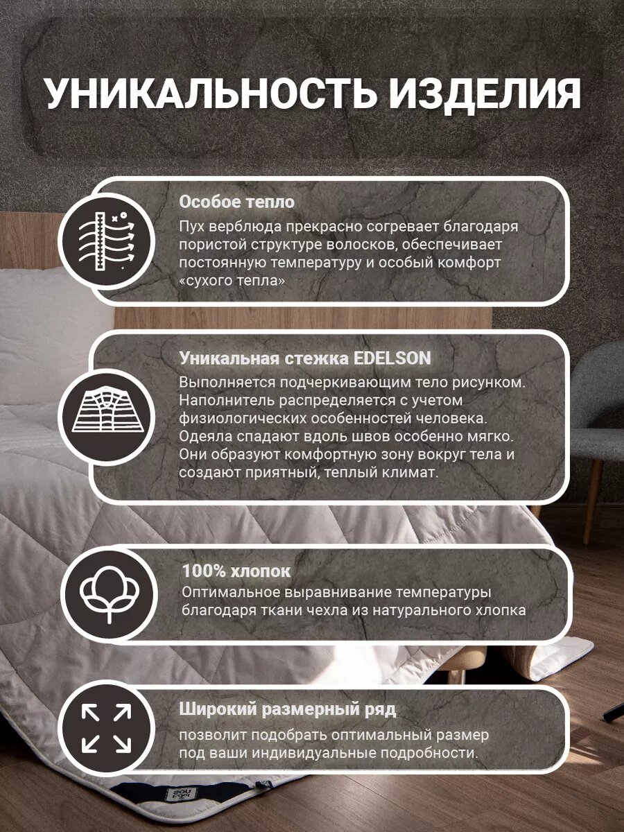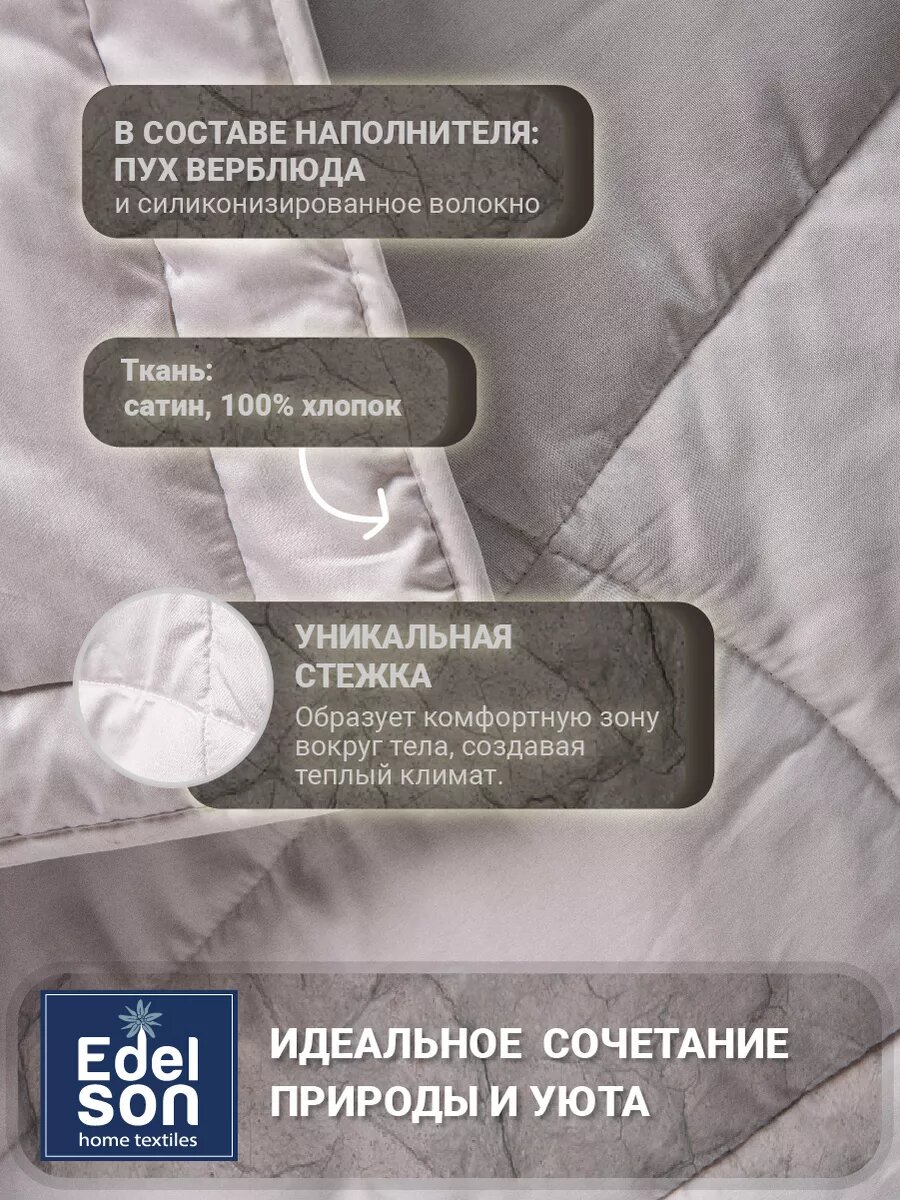 Одеяло Edeson "CAMEL WOOL" 140 х 205 - это теплое и уютное изделие, которое подарит вам комфортный сон в холодное время года.Одеяло изготовлено из высококачественных материалов, таких как верблюжья шерсть и хлопок. Верблюжья шерсть обладает уникальными свойствами, она гипоаллергенна, хорошо сохраняет тепло и обладает антибактериальными свойствами. Хлопок придает одеялу мягкость и комфорт.Благодаря своим свойствам, одеяло Edeson "CAMEL WOOL" обеспечивает оптимальный микроклимат для вашего тела, предотвращая перегрев и обеспечивая здоровый сон.Одеяло Edeson "CAMEL WOOL" 140 на 205 станет отличным выбором для тех, кто ценит комфорт и качество.