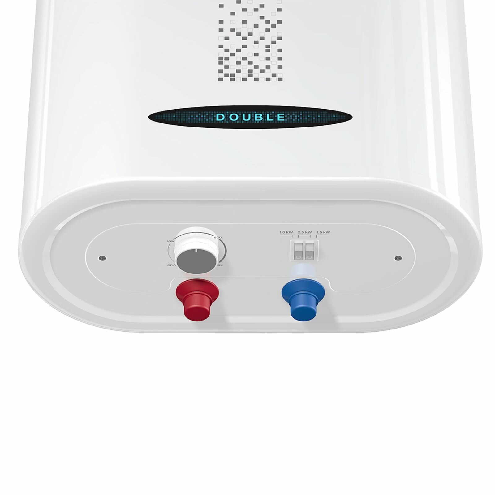 Серия электрических водогрейных приборов Double от российской компании Thermex представлена моделями объемом 30, 50, 80 и 100 литров из высококачественной нержавеющей стали с добавлением титана, которые обладают высокой устойчивостью к коррозии и соответственно долгим сроком службы. Ассортимент линейки имеет два резьбовых соединения — синего и красного цвета, что соответствует подключению холодной и горячей воды.