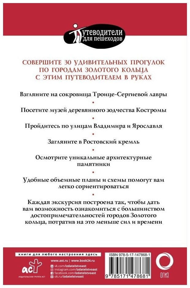 Уже давно мы с семьей планировали поездку по Золотому кольцу, знаменитому маршруту России, но все никак не удавалось реализовать задуманное, так как не было понимания каким образом организовать этот план самостоятельно без экскурсоводов и туристических агенств... на помощь пришла замечательная книжечка, Прогулка по городам и центрам притяжения золотого кольца. Я думаю, что это отличное подробное издание - Путеводитель для пешеходов. С этой книгой не потребуется никакого гида. Нам очень понравилась поездка. Величественные, вековые города России -- это всенародное достояние и всеобщее наследие, которые непременно должен посетить каждый! Большое спасибо редактору и автору этого путеводителя за подробное описание достопримечательностей и яркие картинки! Каждому туристу советую приобрести эту незаменимую книгу!