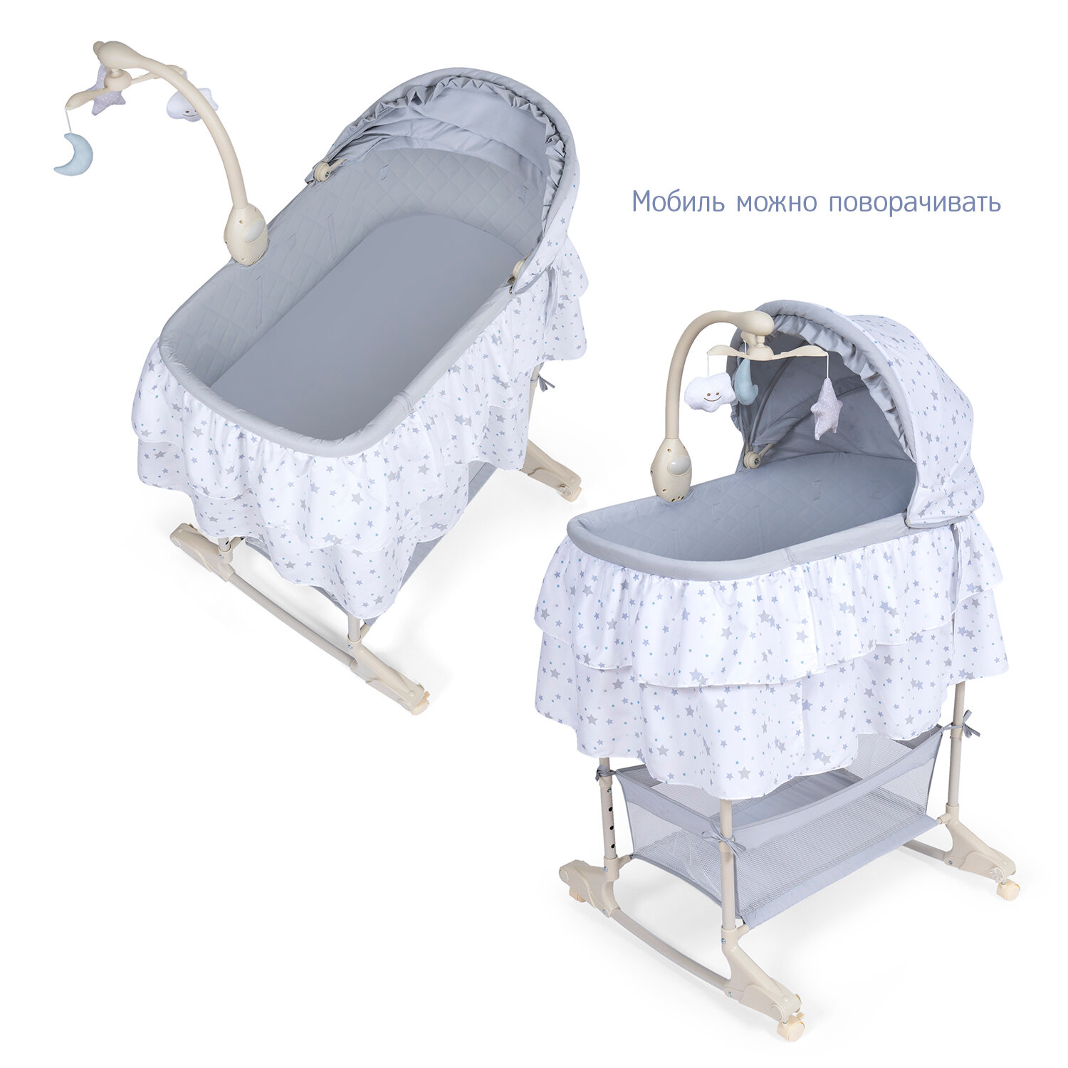 Колыбель предлагает 2 варианта укачивания: с помощью режима виброкачания и вручную на поперечных полозьях. Виброукачивание помогает малышам, которых беспокоит вздутие живота и колики, а ручное укачивание на полозьях будет возможным после того, как колесики сложатся внутрь полозьев. Чтобы предотвратить случайное перемещение колыбели п