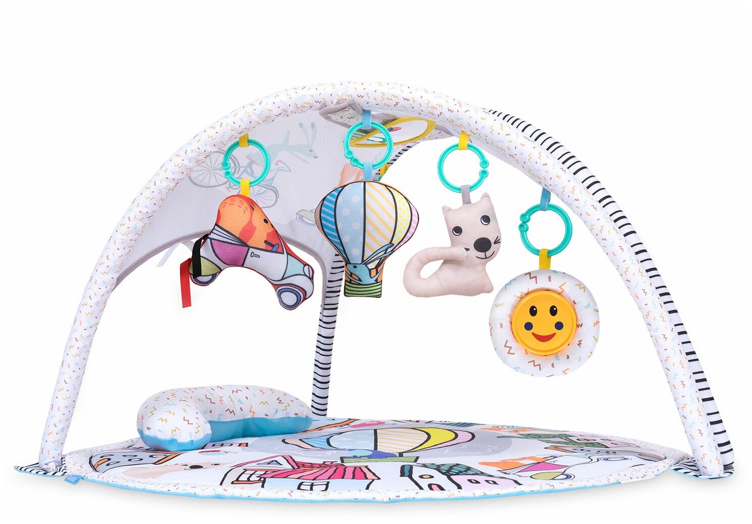 Уже с первых дней жизни ребёнок начинает активно изучать открывшийся ему новый мир - пусть даже поначалу лёжа и наощупь. Развивающий коврик Piccobine Genio G1 обеспечит комфорт и безопасность этого увлекательного и крайне важного процесса познания. На утолщённом, мягком основании из практичного и лёгкого в уходе материала удобно лежать, а впоследствии — тренироваться в переворотах. Занятные игрушки, которые можно прикрепить к дугам, а можно дать в ручки ребёнку, побуждают малыша тянуться, хватать и щупать,