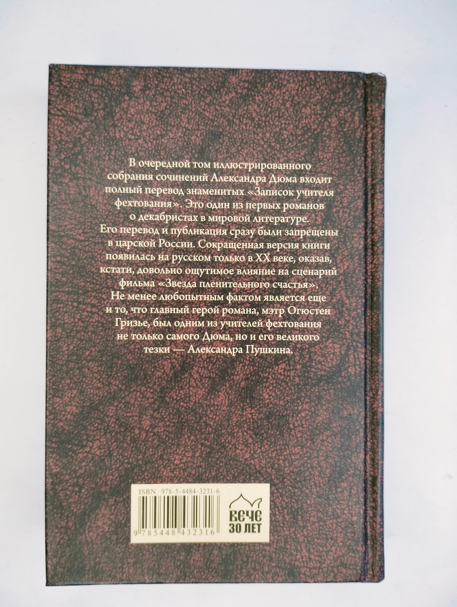 В очередной том иллюстрированного собрания сочинений Александра Дюма входит полный перевод знаменитых «Записок учителя фехтования». Это один из первых романов о декабристах в мировой литературе. Его перевод и публикация сразу были запрещены в царской России. Сокращенная версия книги появилась на русском только в XX веке, оказав, кстати, довольно ощутимое влияние на сценарий фильма «Звезда пленительного счастья». Не менее любопытным фактом является еще и то, что главный герой романа, мэтр Огюстен Гризье, был одним из учителей фехтования не только самого Дюма, но и его великого тезки — Александра Пушкина.