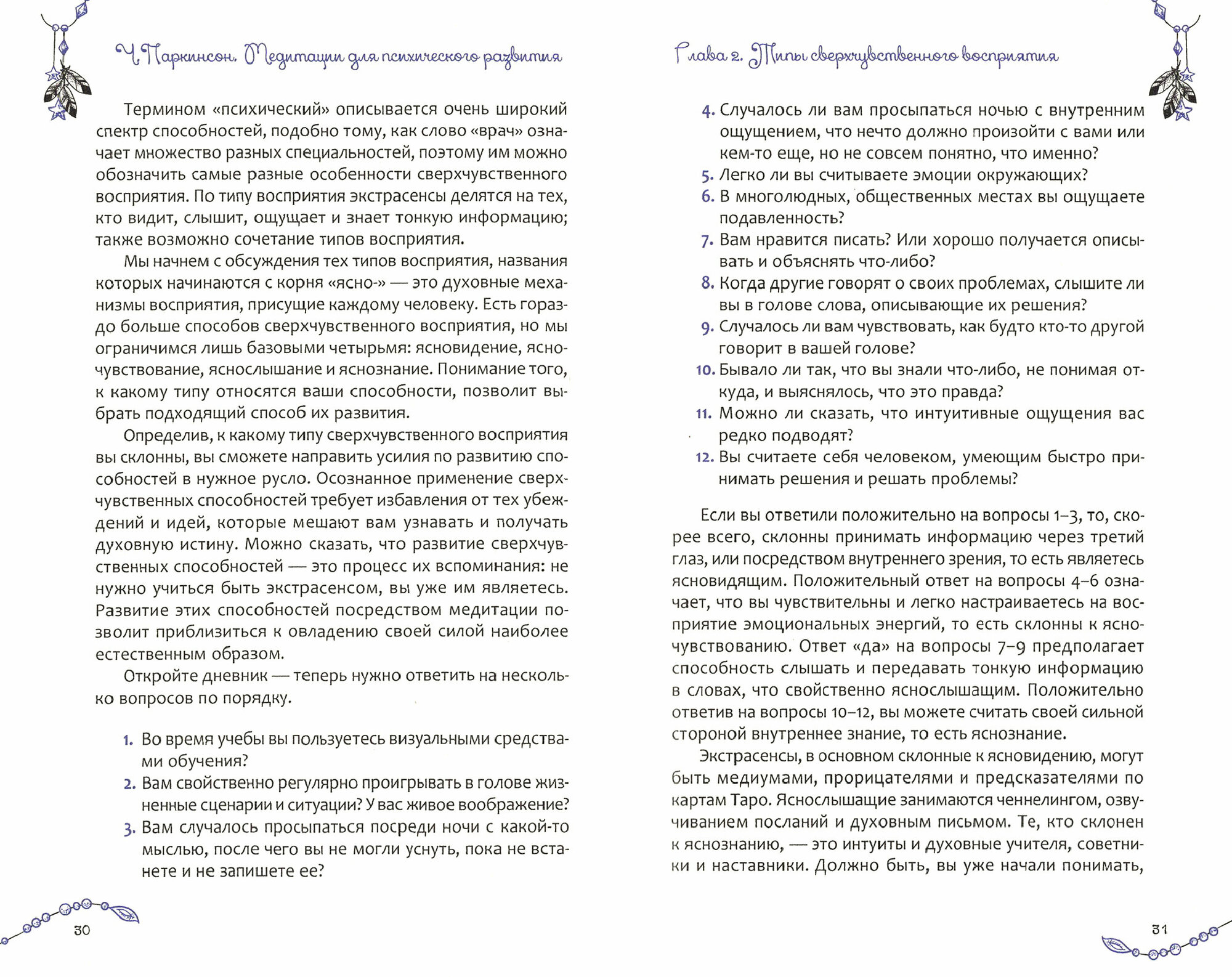 "Эта книга появилась как результат двадцатилетнего опыта работы: в ней собраны практики, упражнения, знания и мудрость, которые являются частью моей собственной жизни, образования и обучения других. Каждый человек найдет в этой книге что-то свое; и вы, и я обладаем способностью к сверхчувственному восприятию, но получаем информацию по-разному. Познавая свои личные способы восприятия тонкой информации, можно испытывать эйфорию, чувство удовлетворенности и откровения; эти открытия позволяют лучше узнать себя и ощутить гармонию с миром вокруг". Чанда Паркинсон