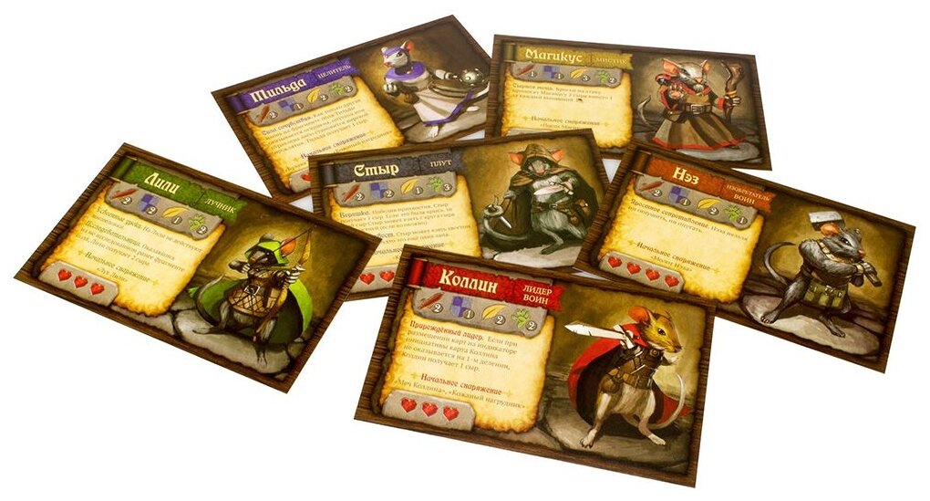 | Комплектация | планшет сказки, 8 двусторонних тайлов местности, 71 карта обыска, 28 карт способностей мышей, 19 карт инициативы, 18 карт встреч, 16 фигурой прихвостней, 6 фигурок мышей, 6 карточек персонажей, 5 специальных кубиков, жетоны, книга сценариев, правила игры |