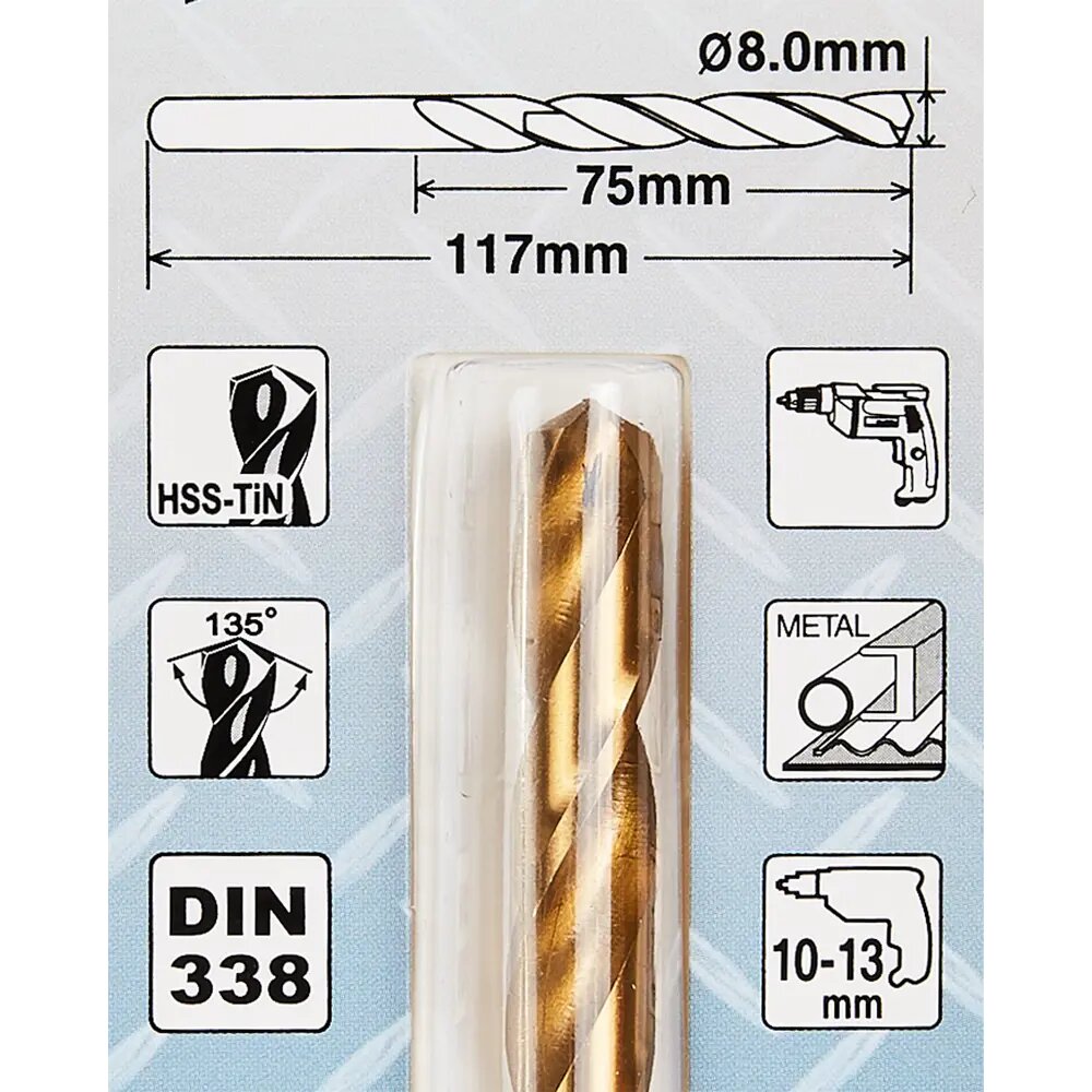 Сверла по металлу HSS-TiN предназначены для сверления отверстий в чугуне, нержавеющей, легированной, нелегированной стали с пределом прочности вплоть до 900 Н/мм². TiN (нитрид титана) - это химическое соединение титана и азота, обеспечивающее низкое трение. Таким образом, это соединение может эффективно использоваться для снижения износа. Сверла HSS-TiN имеют угол при вершине 135°, что препятствует соскальзыванию сверла в начале работы.
