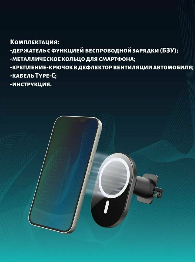 Беспроводное (индукционное) зарядное устройство для смартфона, в дефлектор вентиляции автомобиля.В комплекте: держатель с функцией беспроводной зарядки (БЗУ), металлическое кольцо, крепление в дефлектор вентиляции автомобиля, кабель Type-C, инструкция. Максимальная мощность: 15 Вт.
