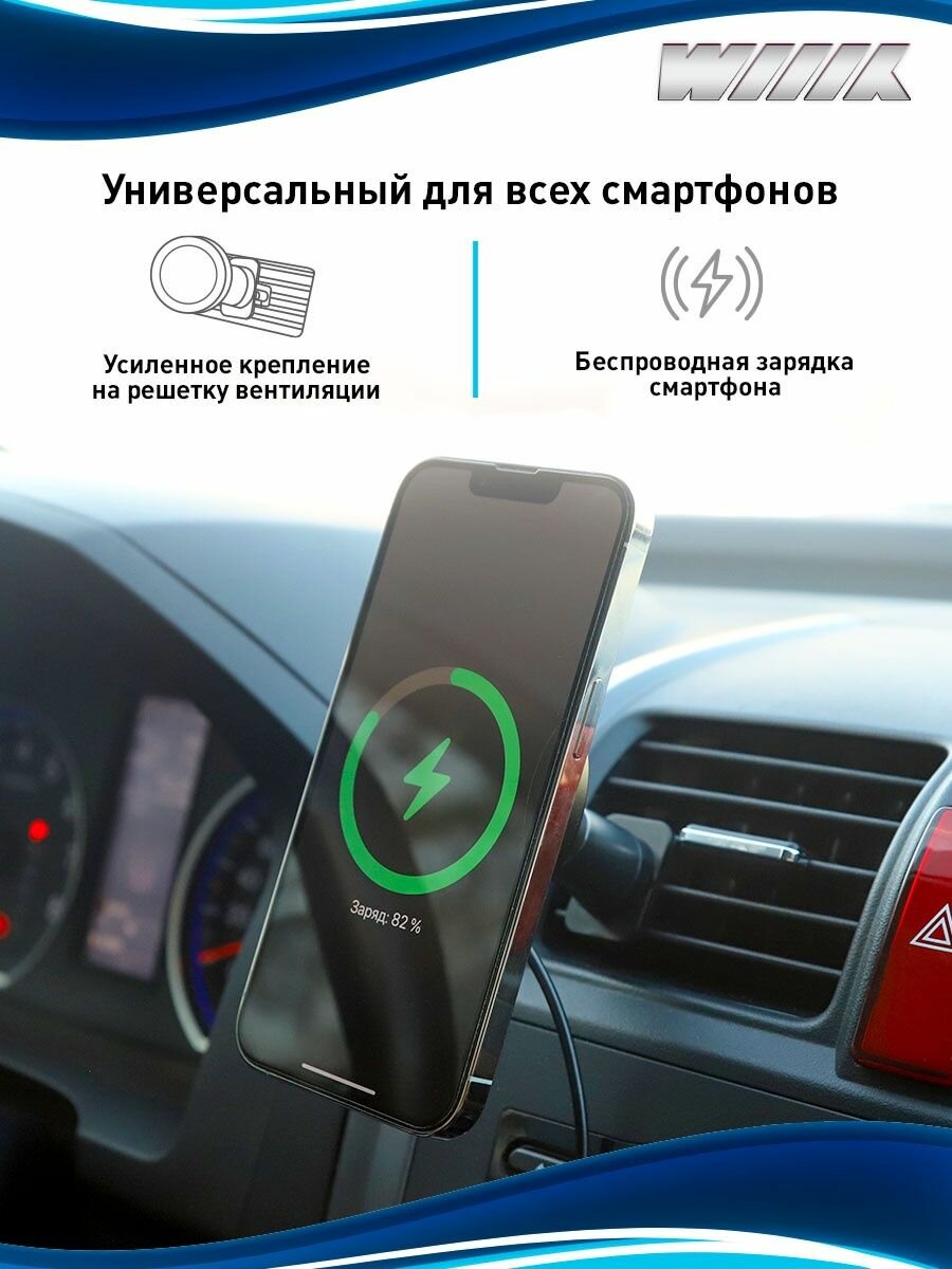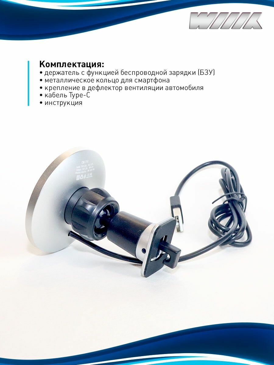 Беспроводное (индукционное) зарядное устройство для смартфона, в дефлектор вентиляции автомобиля. В комплекте: держатель с функцией беспроводной зарядки (БЗУ), металлическое кольцо, крепление в дефлектор вентиляции автомобиля, инструкция.Максимальная мощность: 15 Вт.