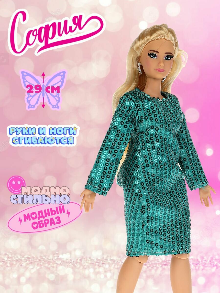 Модница-София одета в приталенное изумрудное платье из блестящих пайеток. Одежду легко снять и надеть. С такой модной куклой девочке будет интересно и весело играть: благодаря тому, что руки и ноги куклы подвижны, им можно придать любое положение. У Софии длинные красивые волосы, которые хозяйка куклы сможет заплетать в разные причёски. Детально проработанный дизайн игрушки вдохновит девочку на новые игровые сюжеты.