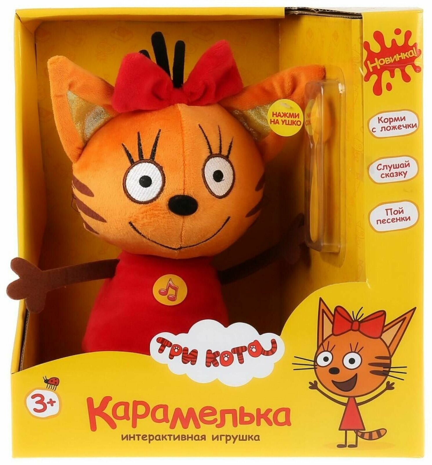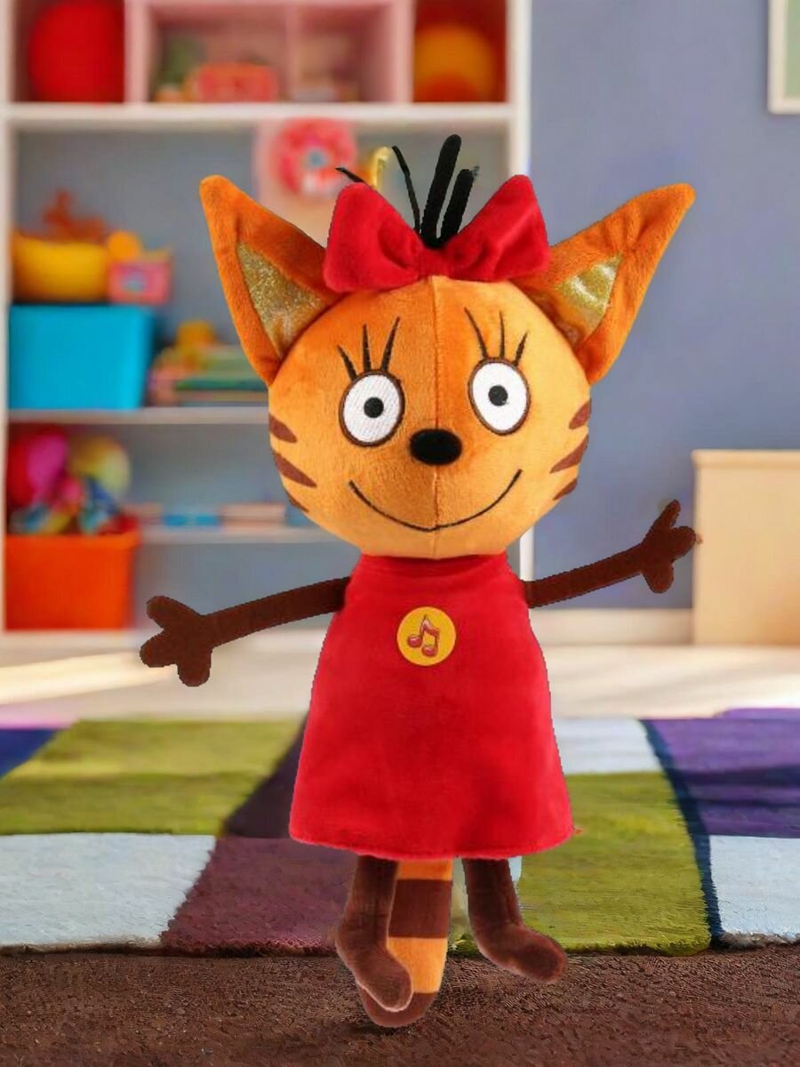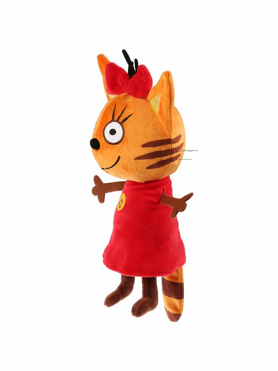 На очаровательной кошечке красное платье платье и бантик. Дети вспомнят знакомые сюжеты для игр и придумают новые. Карамелька так любит учиться, поиграйте с ней в школу, вместе вы узнаете столько всего интересного. Откройте уютное кафе для игрушек и угощайте их самыми вкусными блюдами. Фантазируйте! Ребёнку не придётся скучать по любимой героине мультфильма, ведь теперь она всегда будет с ним. Карамелька будет рада встрече со своими друзьями. Соберите всю коллекцию мягких игрушек из мультсериала «Три кота».