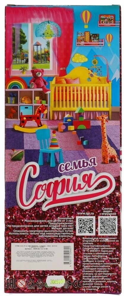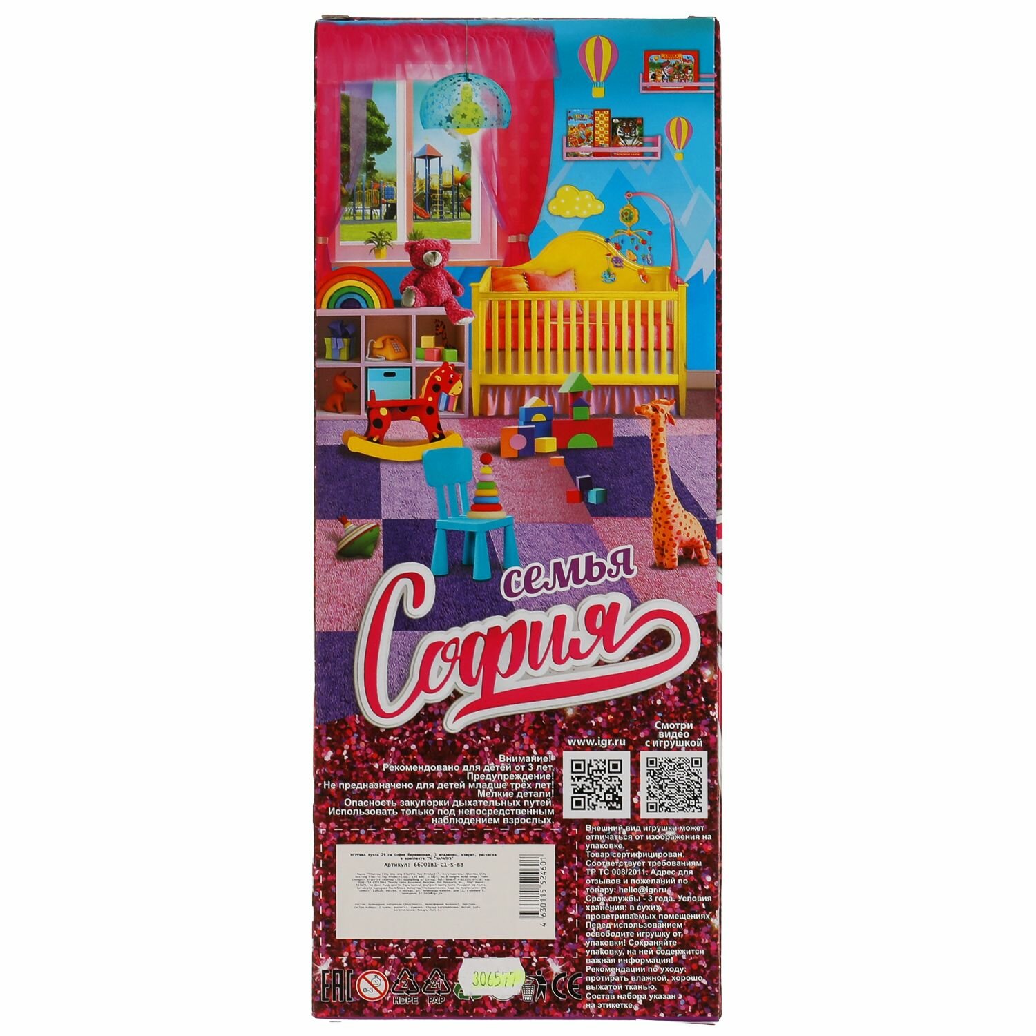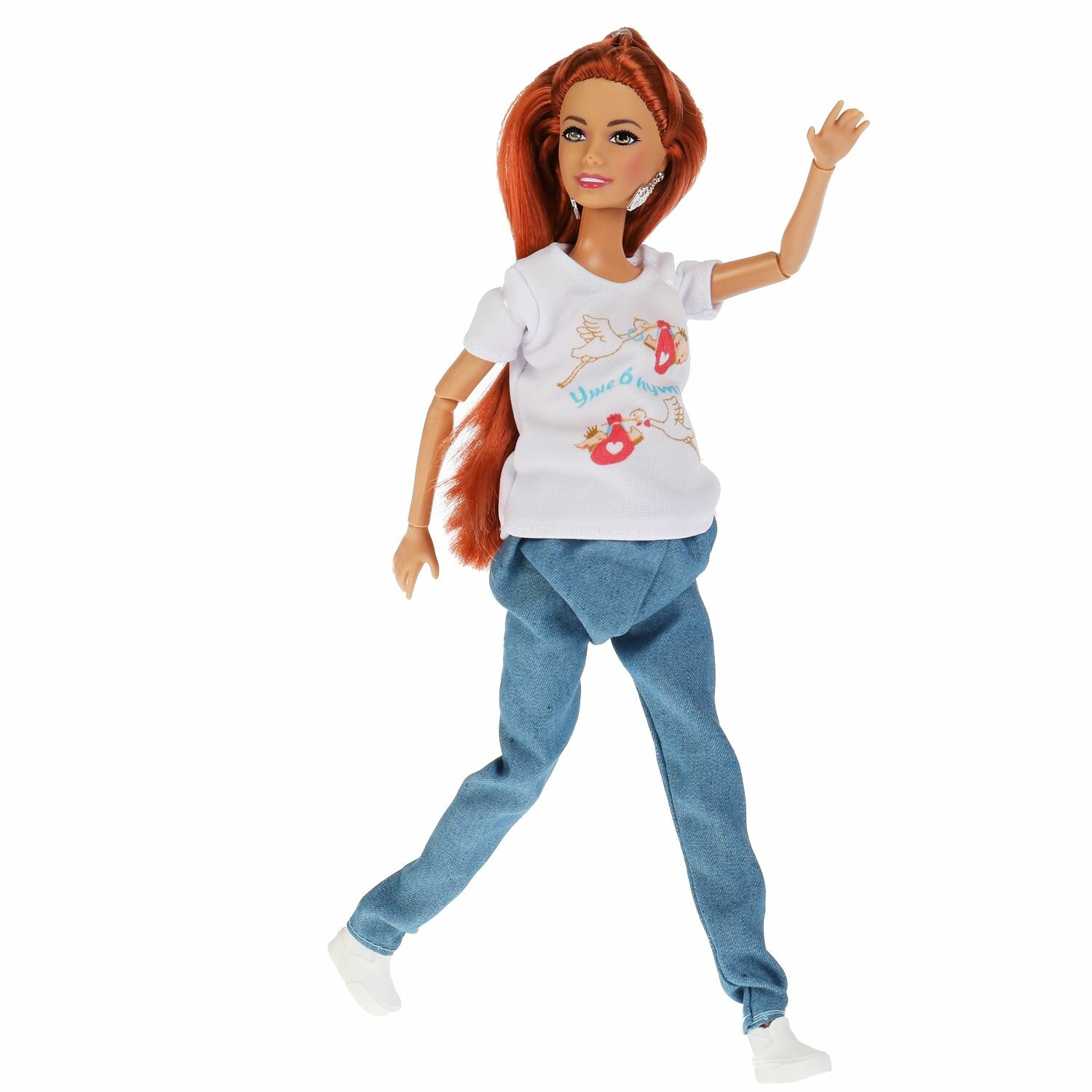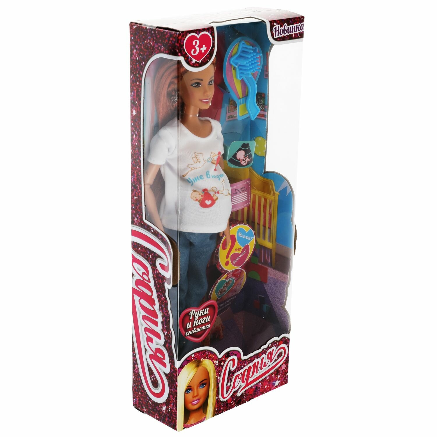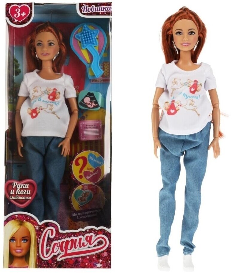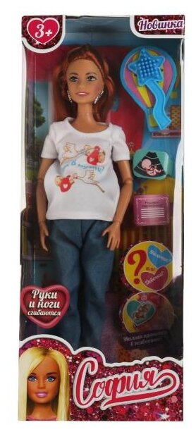 Будущая мама София одета в стильную футболку с принтом и базовые джинсы. Образ куколки дополняют модные крупные серьги и элегантная сумочка. Одежду и аксессуары легко снять и надеть. С такой модной куклой девочке будет интересно и весело играть: благодаря тому, что руки и ноги куклы подвижны, им можно придать любое положение. У Софии длинные красивые волосы, которые хозяйка куклы сможет заплетать в разные причёски. Детально проработанный дизайн игрушки вдохновит девочку на новые игровые сюжеты.