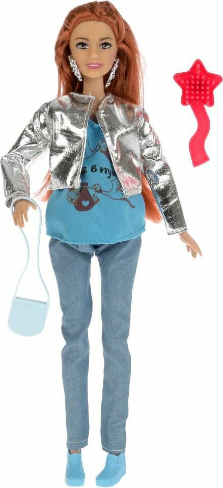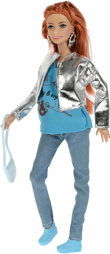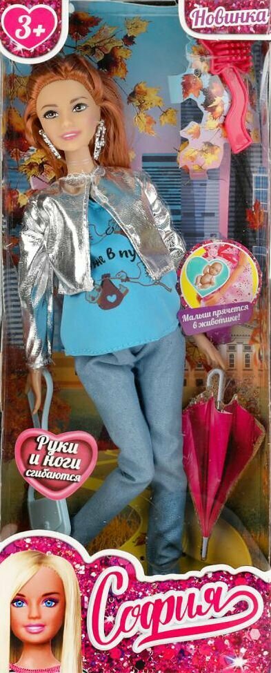 Будущая мама София одета в стильную серебристую куртку, яркую футболку и практичные джинсы. Образ куколки дополняют модные крупные серьги и элегантная сумочка. Одежду и аксессуары легко снять и надеть. С такой модной куклой девочке будет интересно и весело играть: благодаря тому, что руки и ноги куклы подвижны, им можно придать любое положение. У Софии длинные красивые волосы, которые хозяйка куклы сможет заплетать в разные причёски. Детально проработанный дизайн игрушки вдохновит девочку на новые игровые сюжеты.