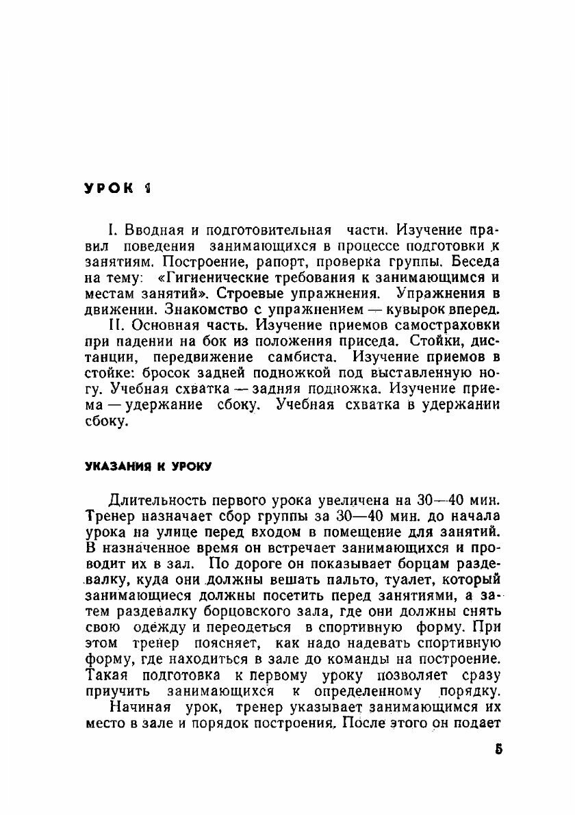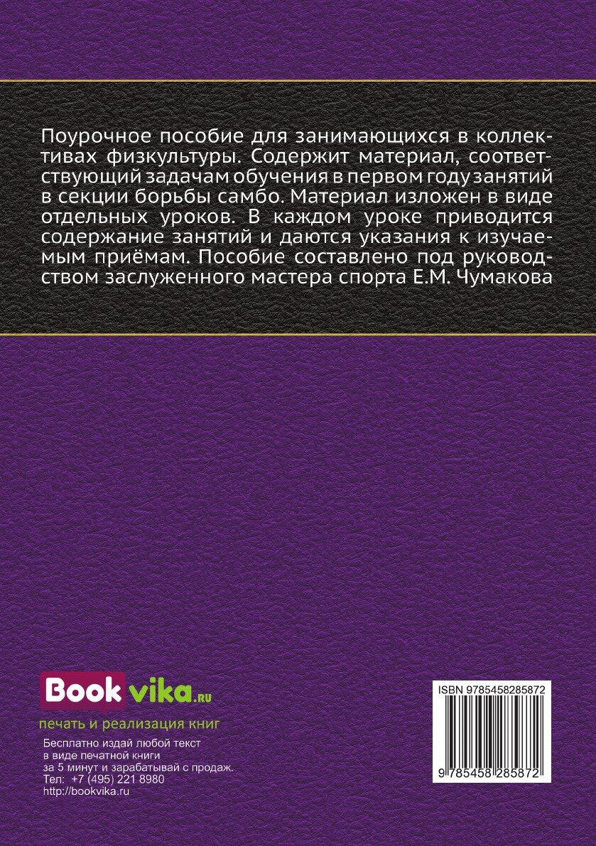 Поурочное пособие для занимающихся в коллективах физкультуры. Содержит материал, соответствующий задачам обучения в первом году занятий в секции борьбы самбо. Материал изложен в виде отдельных уроков. В каждом уроке приводится содержание занятий и даются указания к изучаемым приёмам. Пособие составлено под руководством заслуженного мастера спорта Чумакова Е.М.