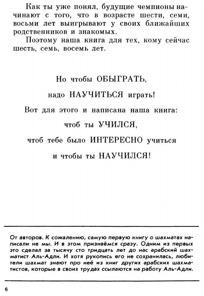 Эта книга - репринт оригинального издания (издательство "Детская литература", 1980 год), созданный на основе электронной копии высокого разрешения, которую очистили и обработали вручную, сохранив структуру и орфографию оригинального издания. Редкие, забытые и малоизвестные книги, изданные с петровских времен до наших дней, вновь доступны в виде печатных книг.Итак, на какое-то время вы становитесь педагогом и тренером и вместе с собственным сыном (или дочерью) стараетесь постичь основные законы и правила шахматной игры. Скажем прямо, задача возлагается на вас достаточно трудная. Поэтому запаситесь терпением. Вы можете пробудить интерес к шахматам и можете на долгие годы отбить охоту у собственного ребёнка даже прикасаться к шахматным фигурам. Если в качестве отца вы могли иногда дать волю своему родительскому гневу, в качестве тренера поступать так вы не имеете права. Это не предостережение, это напоминание. Мы бы не хотели, чтобы нашу книгу рассматривали как учебник в ней нет многих необходимых для учебника разделов. Наша цель была несколько иная: не столько обучить, сколько привить интерес к шахматам. Поэтому и форма изложения, которую мы выбрали, не случайна. Сколько же потребуется времени, чтобы ваш ребёнок научился хорошо играть в шахматы? Никто, конечно, заранее ответить на этот вопрос не может. Но в том, что в семь или восемь лет можно научиться хорошо играть, сомневаться не приходится. И последнее. Если, изучив эту книгу, ещё несколько тысяч ребят пополнят многомиллионную армию любителей шахмат, задача, которую ставили перед собой авторы, будет выполнена.Издательство ЁЁ МедиаМягкий переплетОбъем - 224 стр.Формат - 148x210 мм.ISBN 978-5-458-27515-6Год издания: 2012