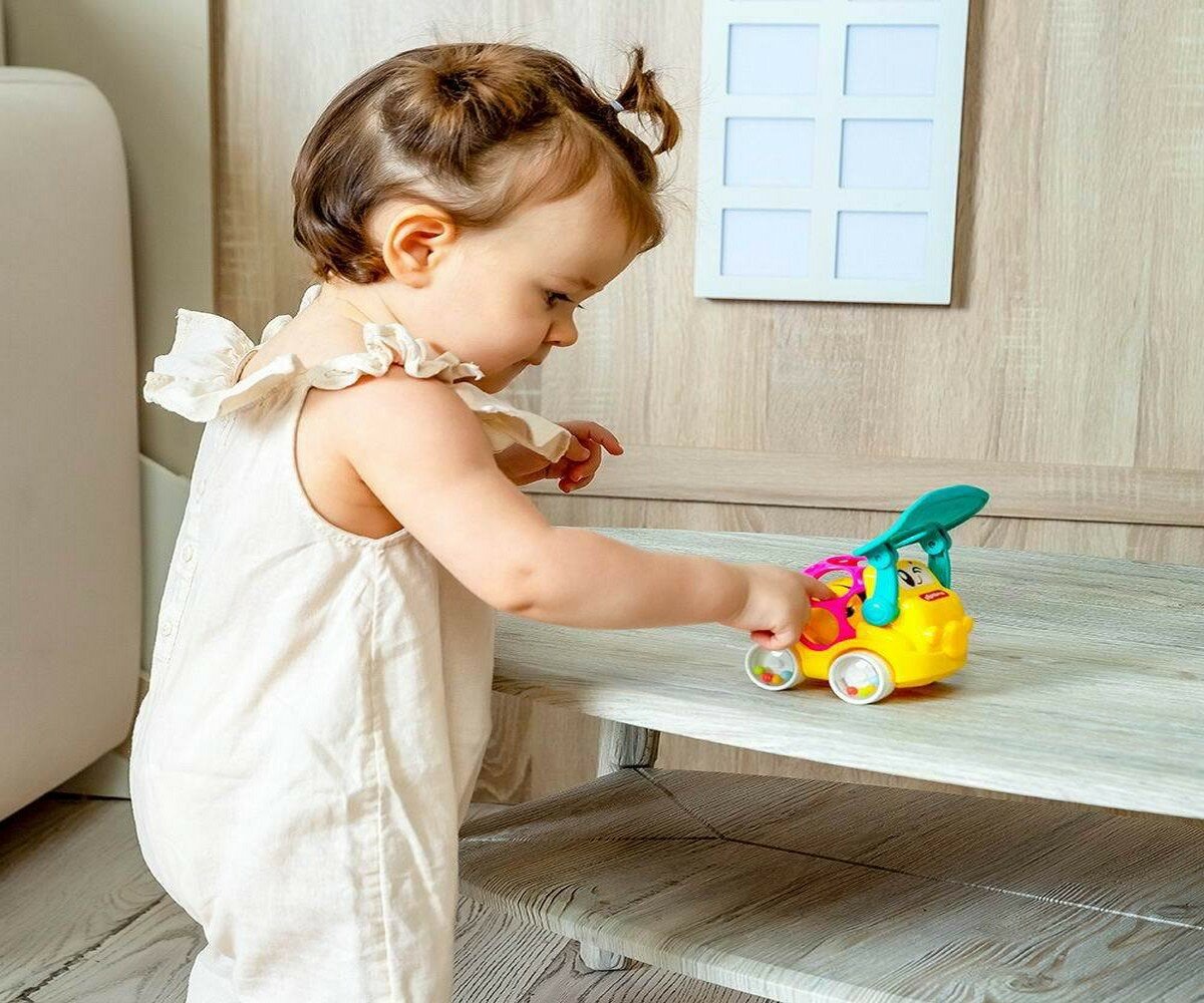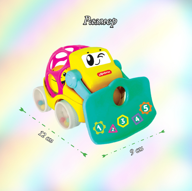 Чудо-машинка для самых маленьких – с мячиком в кузове! Она звучит при движении! Малыш будет катать бульдозер – и слушать веселые песенки («Бибика», «Песенка про счет», «Гудят машины»), мелодии и звуки транспорта. Колесики звенят, как погремушка, огоньки мигают, отвал поднимается и опускается, а мягкий кузов так приятно потрогать пальчиками! Игра с этой машинкой развивает у ребенка музыкальные способности, двигательную активность, тактильные ощущения. Батарейки: 3AG13/LR44 (в комплекте демонстрационные).