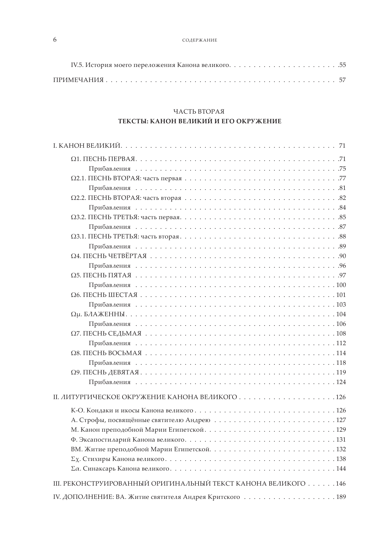 Также в поэтическом и прозаическом переложениях с комментариями представлены дополнительные литургические тексты, традиционно дополняющие Канон: кондак и икос после 6-й песни Канона, эксапостиларий после 9-й, строфы, посвящённые преп. Марии Египетской и автору Канона, синаксарь (просветительское чтение после 6-й песни), житие преп. Марии Египетской и стихиры Канона великого.