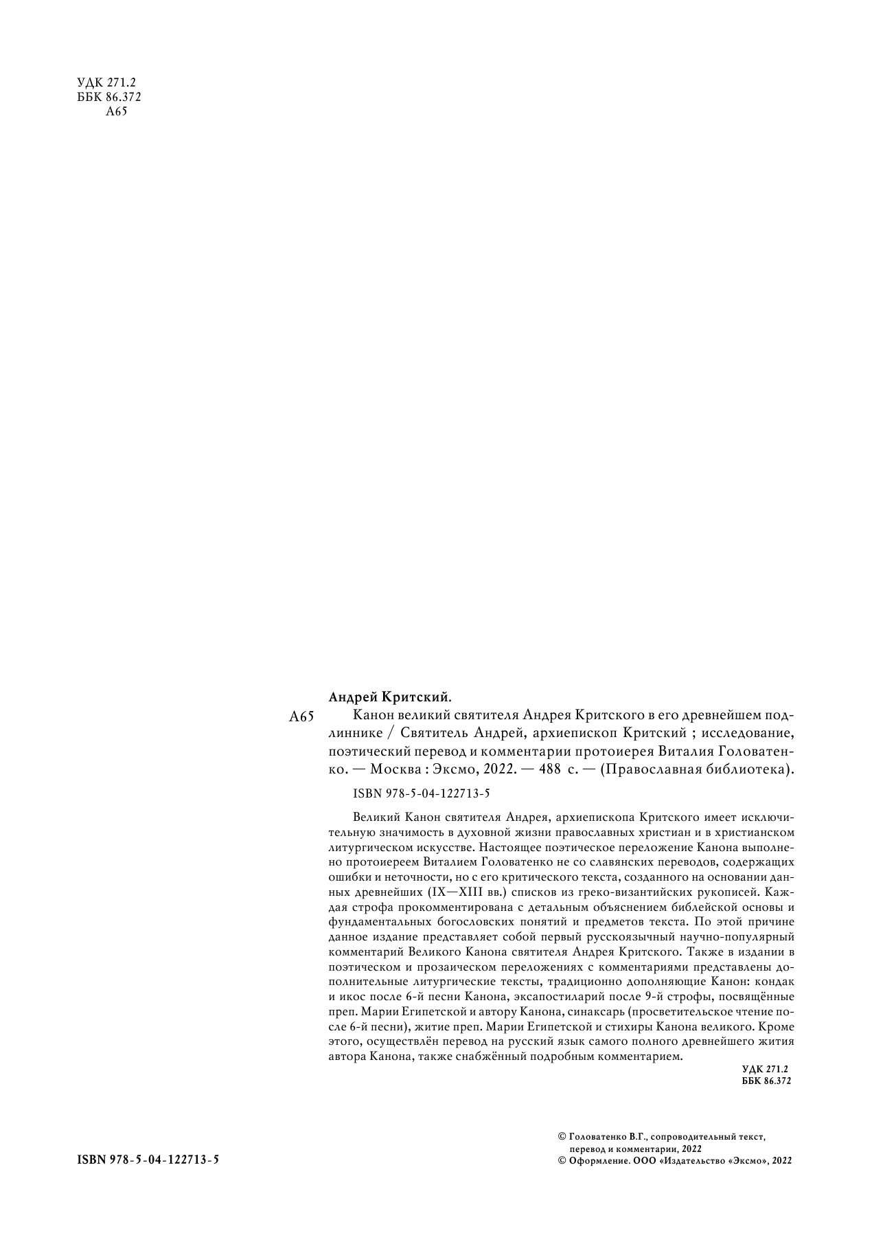 КАНОН ВЕЛИКИЙ свт. Андрея Критского в его древнейшем подлиннике: исследование поэтический перевод и комментарии прот. Виталия Головатенко (Преподобный Андрей Критский); Эксмо, 2022