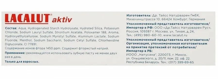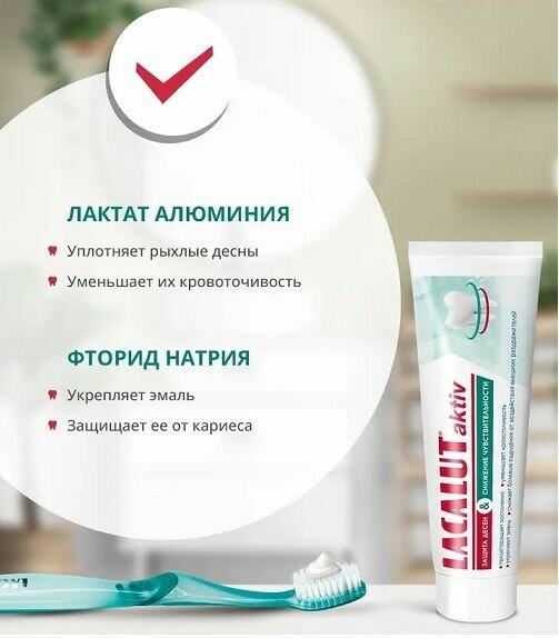 Описание товара:Зубная паста LACALUT aktiv защита дёсен и снижение чувствительности уменьшает воспаление и укрепляет десны, снижает повышенную чувствительность зубов и защищает от кариеса. Забота и дёснах и снижение чувствительности: лактат алюминия и хлоргексидин укрепляют десны и предотвращают их воспаление и кровоточивость; комплекс неорганических солей снижаетчувствительность зубов; фторид натрия укрепляет эмаль и защищает от кариеса; мягкие абразивы тщательно и бережно очищают зубную эмаль от бактериального налёта.Состав товара:Aqua, hydrogenated starch hydrolysate, hydrated silica, potassiumchloride, strontium acetate, poloxamer 188, sodium lauryl sulfate, aroma, hydroxyethylcellulose, aluminum lactate, sodium myristyl sulfate, sodium fluoride, menthol, sodium saccharin, sodium ethyl sulfate, chlorhexidine digluconate, CI 77891.Меры предосторожности:Только для взрослых.Способ применения:Рекомендуется использовать зубную пасту не менее двух раз в день.