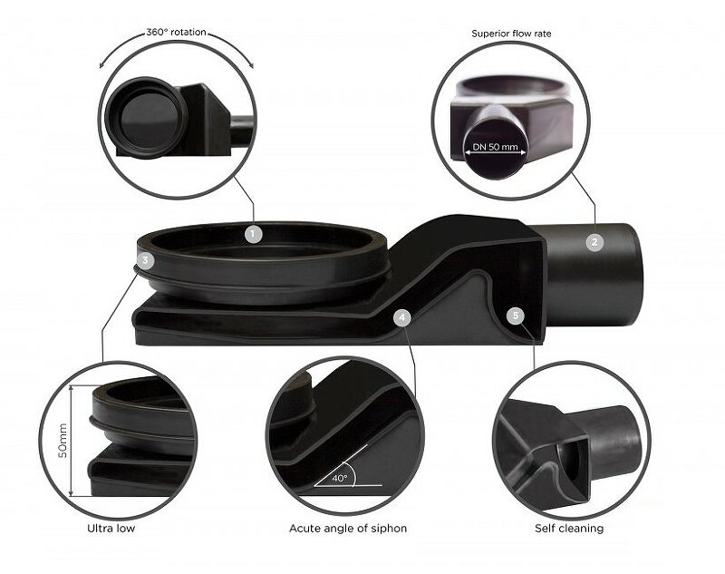 Допустимая толщина керамической плитки 12 мм; Нагрузка на решетку (в соответствии с EN 1253) выдерживает до 300 кг давления (класс K3); Материал: нержавеющая сталь AISI 304 SS дизайн-вставка, ABS корпус; PP переходник, сифон, опоры, грязеулавливающая сеточка, сухой затвор. Применение: ванные и душевые комнаты в квартирах, домах, гостиницах, фитнес-центрах, больницах, бассейнах, коммерческие кухни, супермаркеты, рестораны, аэропорты, застекленные балконы и т.д. Преимущества модели: два дизайна в одной модели за счет двухсторонней дизайн-вставки (с одной стороны матовый хром, с другой стороны полая под плитку); система слива конденсата в канализацию/сток; высокое качество материалов; легкость монтажа и простота обслуживания; S-образный сифон, разработанный с высокой степенью функциональности, предотвращает проникновение запахов из канализации; наличие сухого затвора; длительный срок эксплуатации; возможность регулировки высоты и наклона трапа за счет опор, входящих в комплект.
