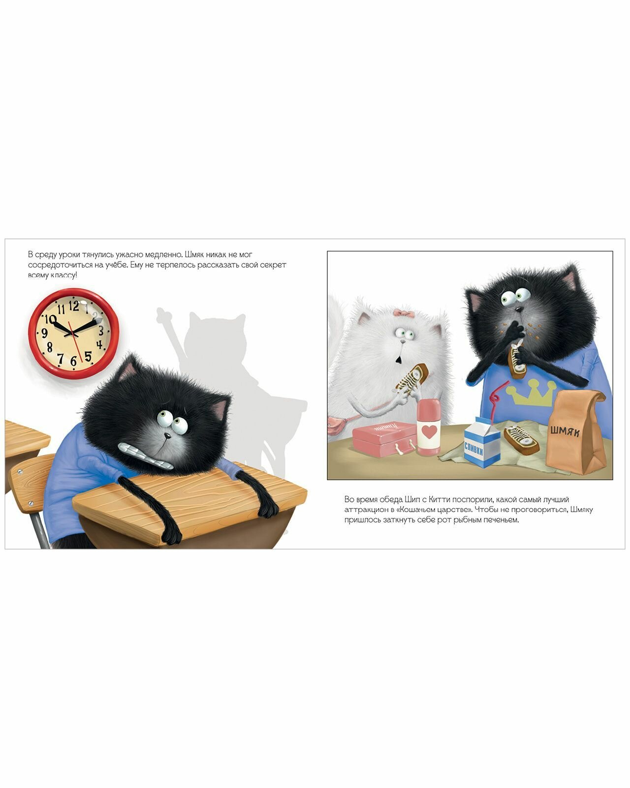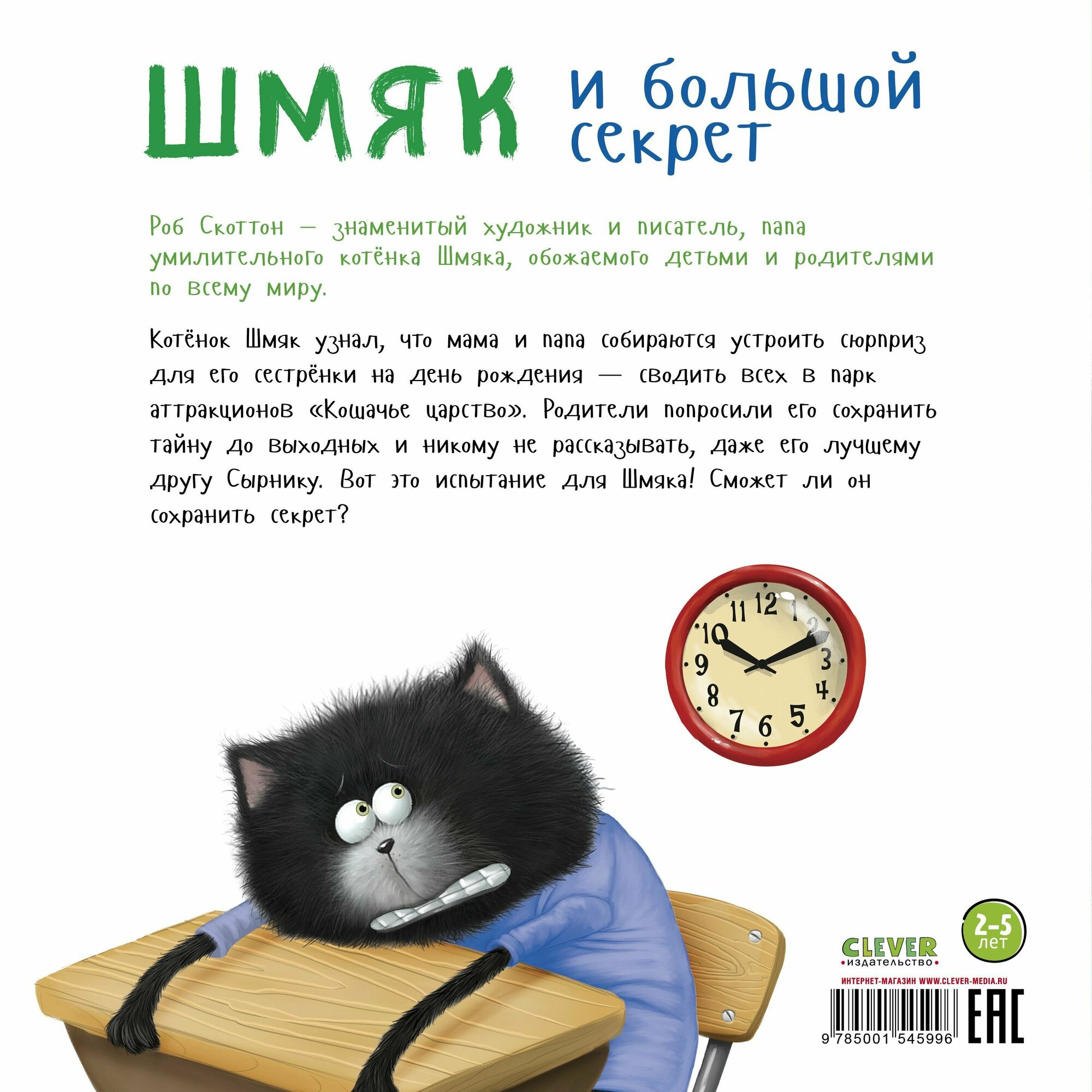 Котёнок Шмяк узнал, что мама и папа собираются устроить сюрприз для его сестрёнки на день рождения — сводить всех в парк аттракционов «Кошачье царство». Родители попросили его сохранить тайну до выходных и никому не рассказывать, даже его лучшему другу Сырнику. Вот это испытание для Шмяка! Сможет ли он сохранить секрет? Шмяк — один из самых любимых героев маленьких читателей, и не случайно. Ваш малыш будет расти и учиться вместе с этим пушистым котенком, в которого просто невозможно не влюбиться.