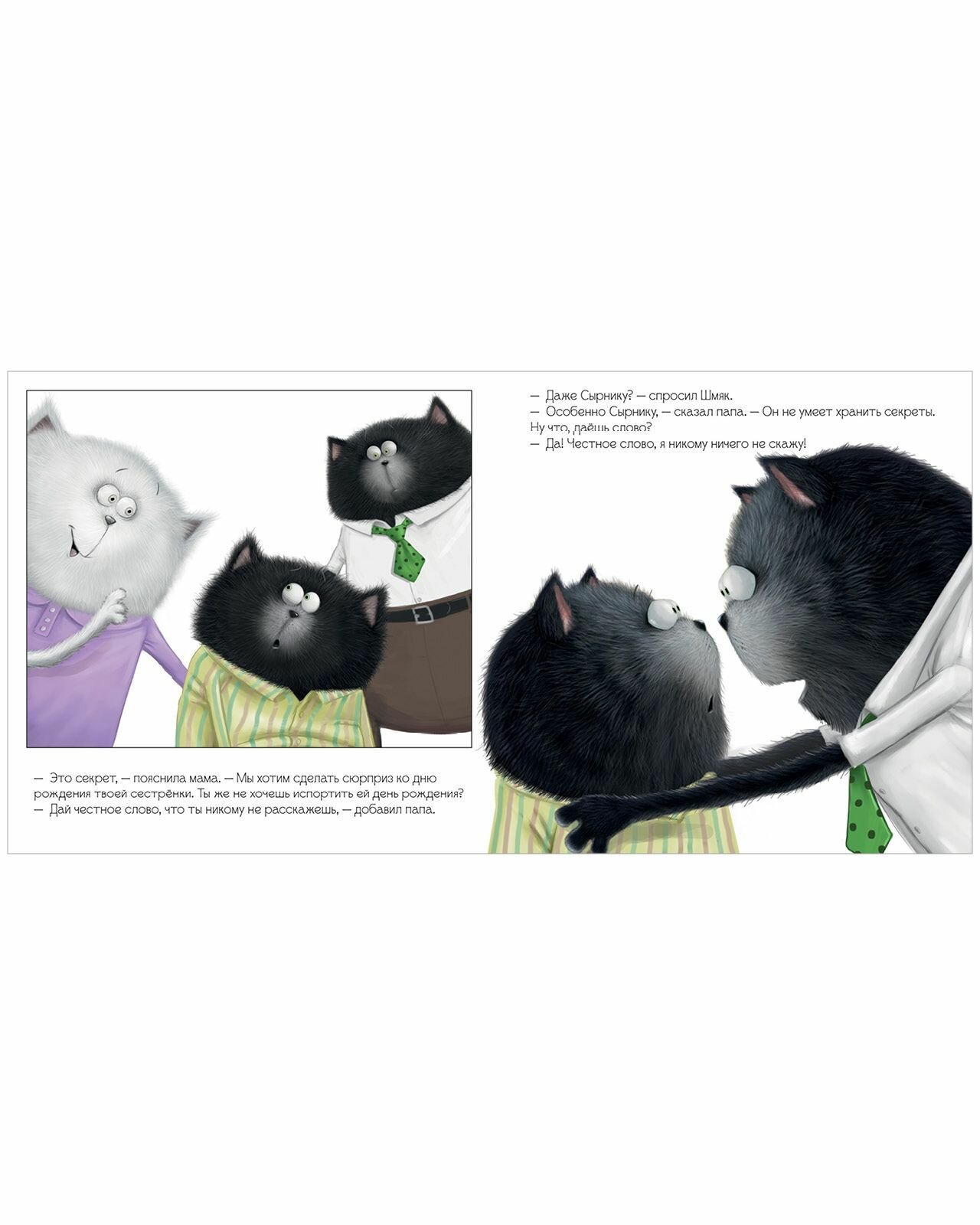 Совершенно случайно котенок Шмяк узнал, что мама и папа готовят для его младшей сестренки сюрприз на день рождения. Они решили всей семьей съездить в самый лучший парк аттракционов «Кошачье царство». Родители попросили котенка сохранить это в секрете и не рассказывать никому, даже своему лучшему другу Сырнику. Шмяк и не думал, что хранить тайны так сложно! Каждый день он был сам не свой, Сырник даже начал подозревать, что со Шмяком что-то не так. Но когда Шмяк увидел, как его сестренка радуется, он понял, что не зря хранил тайну.
