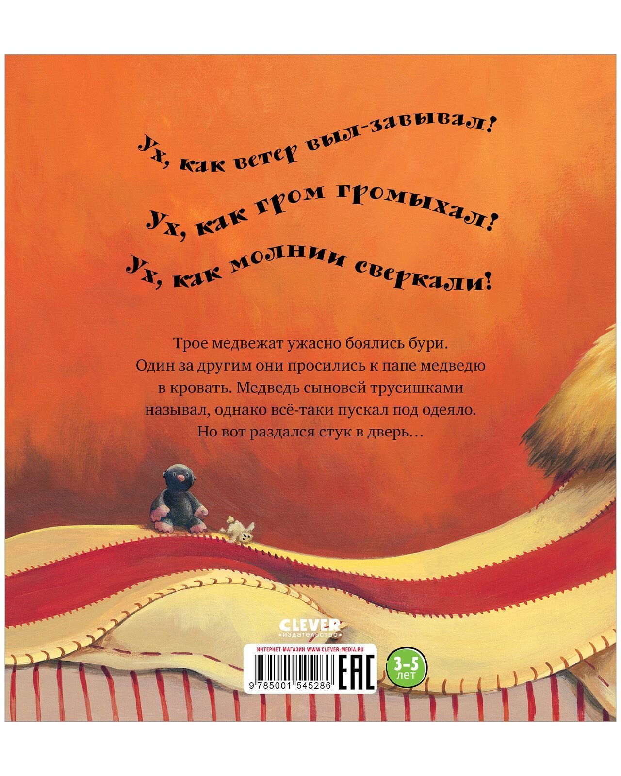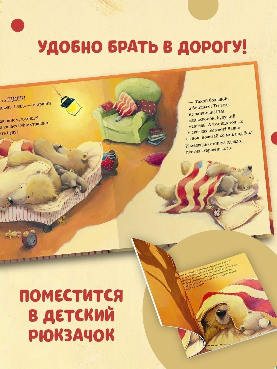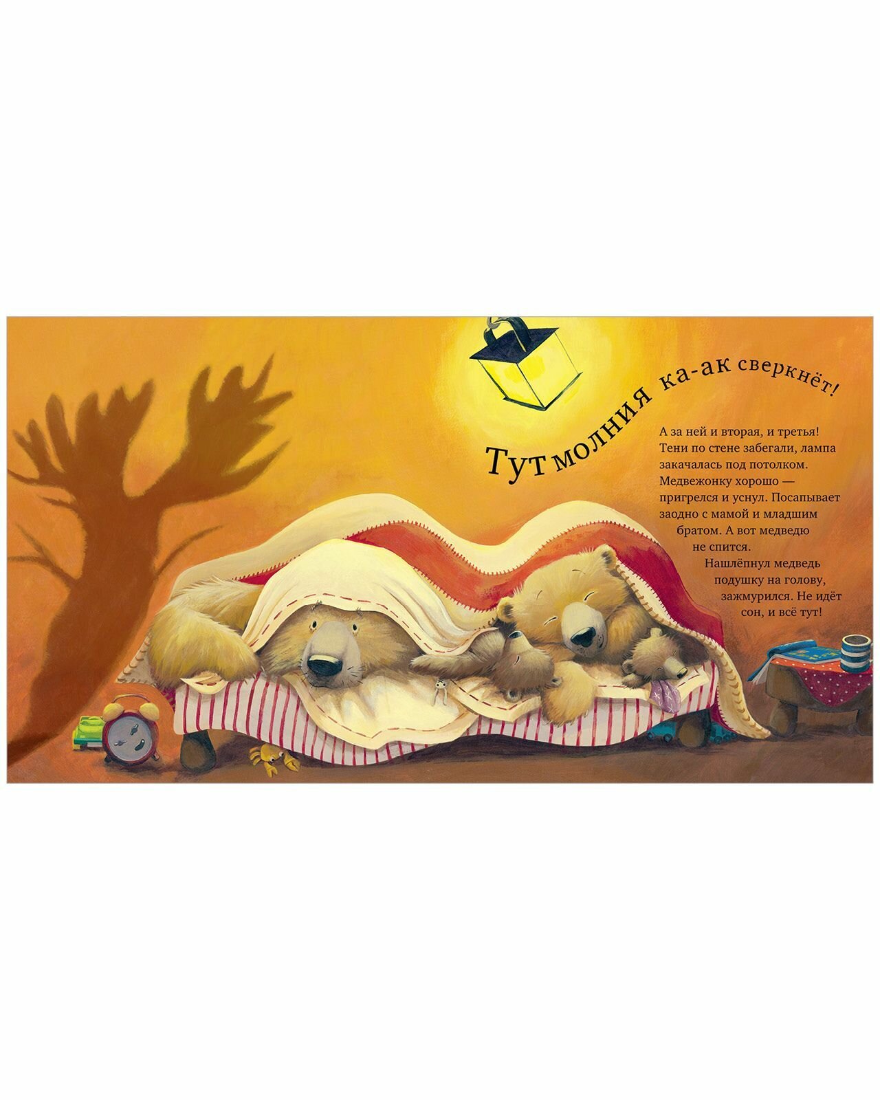 В далеком лесу бушует ураган! Сверкают молнии, пляшут странные тени, и кажется, будто чудище воет у двери! Как тут заснуть маленьким медвежатам? Самое уютное и безопасное место сейчас — комната мамы и папы, ведь с папой буря не страшна! Вот только и папе теперь не спится! Шумит лес, ветви деревьев стучат в окно, гремит гром. И что это за жуткая тень на стене? Быть может, медвежата правы и за дверью кто-то есть?