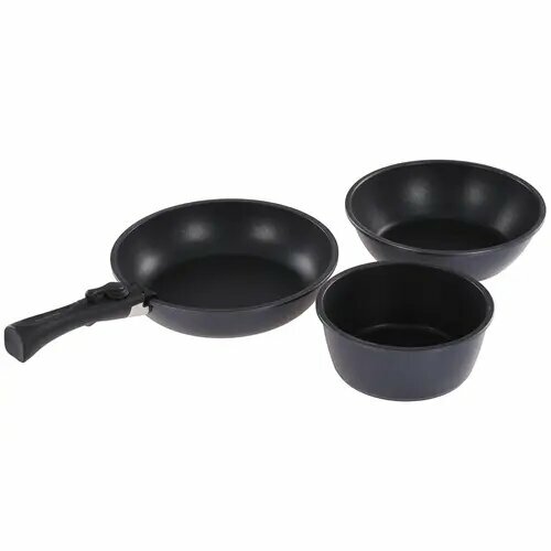 | Состав набора | Глубокая сковорода 24 см – 2,5 л, Сковорода 26 см – 2,5 л, Ковш 18 см – 1,7 л, Съемная ручка |