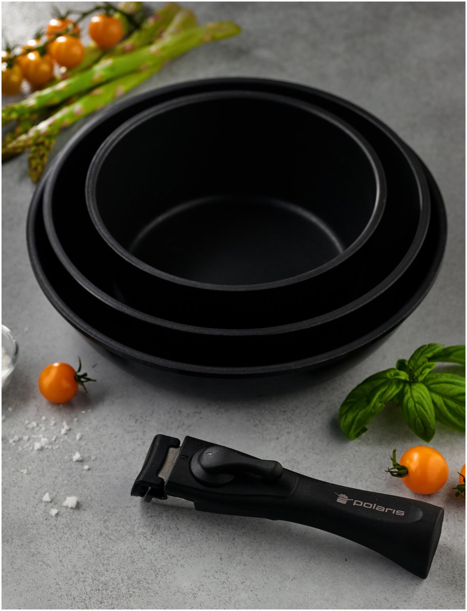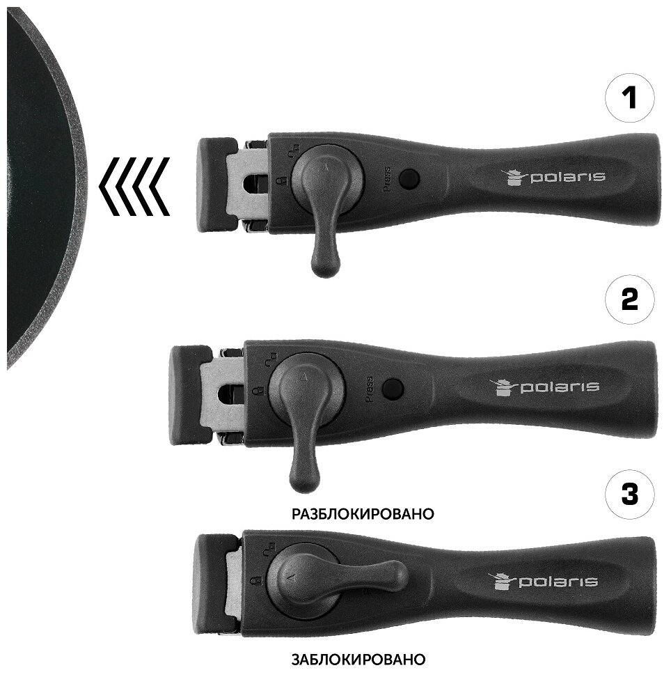 Купила данный набор с хорошей скидкой на открытии магазина вместе с мультиваркой. Ручка съёмная, что очень удобно, когда у тебя маленькая кухня и места для хранения очень мало. Подходит для всех видов плит. За такую цену(2500) получила целый набор хорошей посуды. Спасибо, Polaris!
