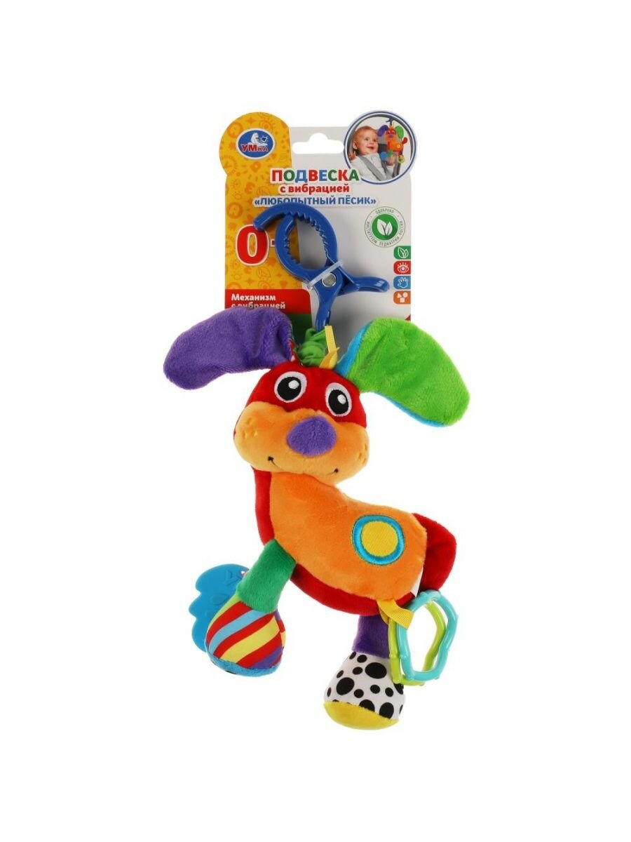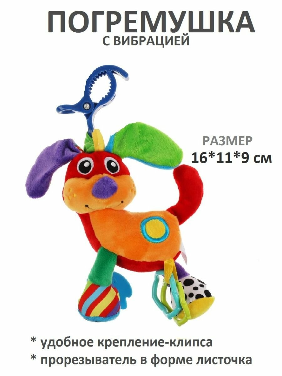 Эта игрушка в виде милой собачки с забавным вибрационным эффектом и весело гремящими элементами непременно приведёт ребёнка в восторг. Подвеска выполнена в ярких цветах из очень мягкого и гипоаллергенного материала. Благодаря креплению-клипсе игрушку удобно крепить к кроватке, коляске или дуге. Прорезыватель интересной формы из качественного безопасного материала пригодится малышу, когда у него будут резаться зубки.