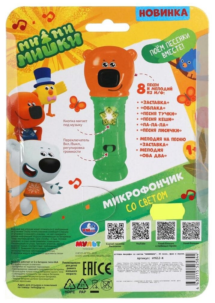 Маленькому любознайке непременно понравится эта занимательная игрушка с оригинальным дизайном в виде любимого персонажа. Он с удовольствием будет нажимать на кнопку в виде звёздочки, красиво светящуюся во время работы микрофона, и слушать песенки из популярного мультсериала, подпевая им и подбадривая себя аплодисментами.