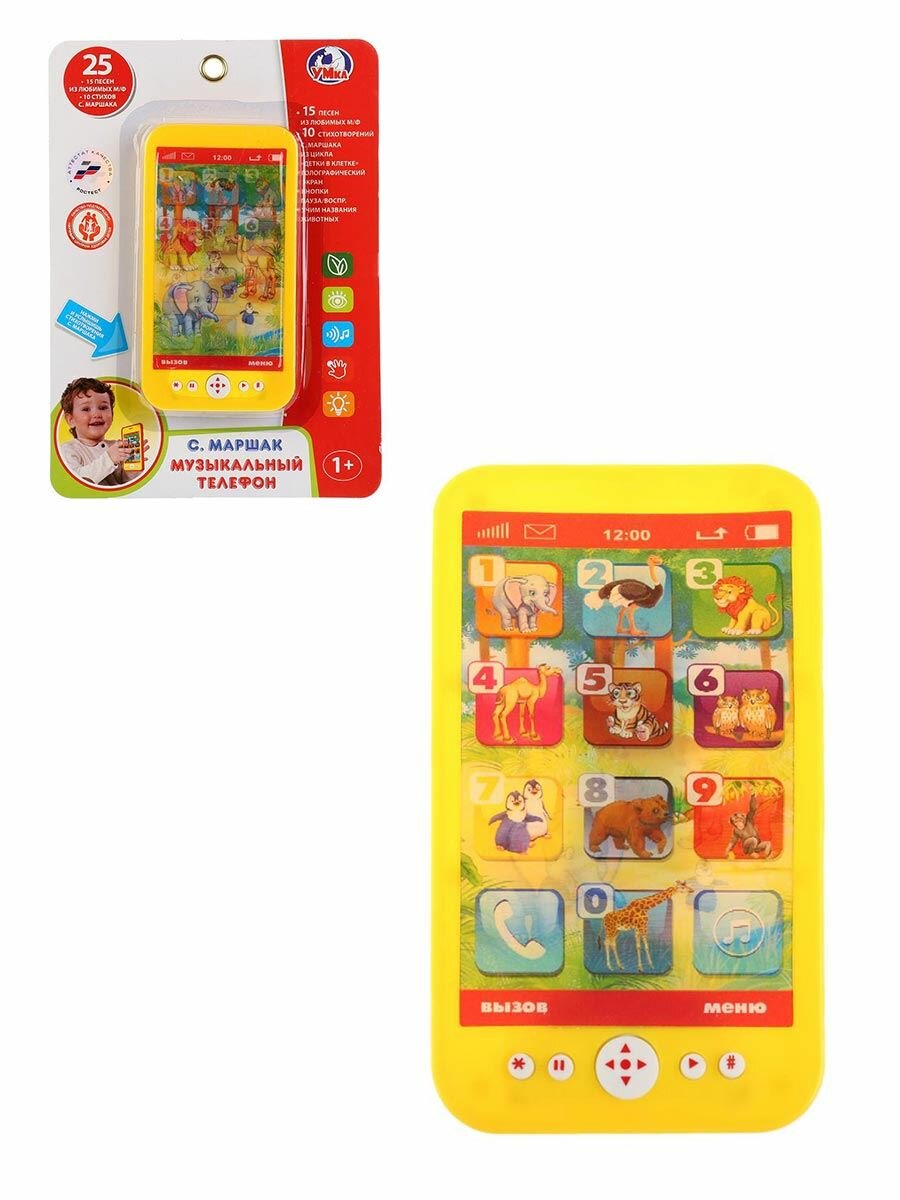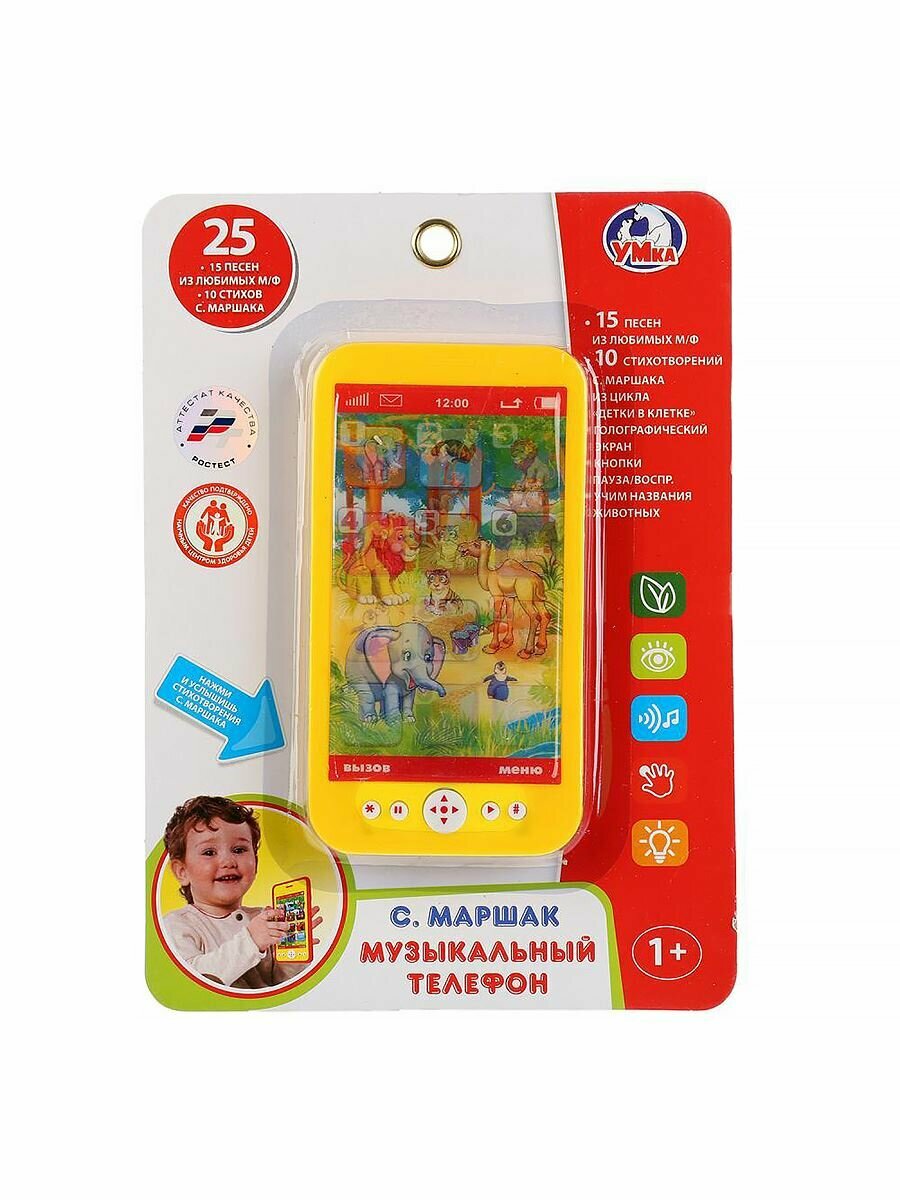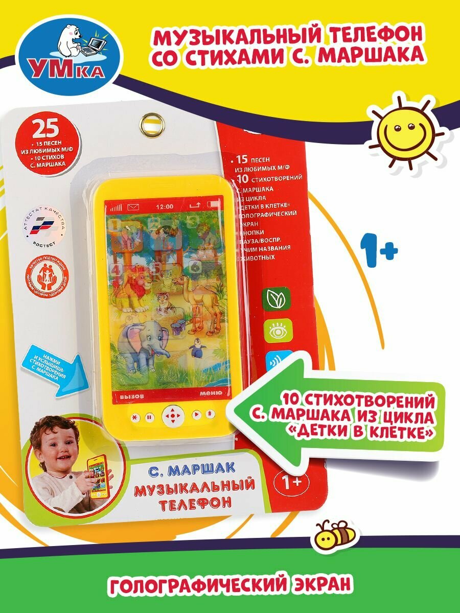 Умка Музыкальный телефон со стихами С. Маршака ТМ УМка станет прекрасным подарком для ребёнка: 10 стихотворений С. Маршака из цикла Детки в клетке. 15 песен из м/ф. Голографический экран. Кнопки Пауза/Воспр. Учим названия животных. Вашего малыша приведёт в восторг эта игрушка в виде яркого телефона. Он с удовольствием будет нажимать на кнопки, слушать замечательные стихотворения Самуила Маршака и весёлые песни из мультфильмов. Благодаря компактному размеру телефон удобно повсюду брать с собой. Музыкальная игрушка ТМ УМка развивает: Мелкую моторику. Пространственное мышление. Внимание. Память. Музыкальный слух. Речь. Размер: 15х8х1 см. Размер упаковки: 25х17х2 см. Материал: пластмасса. Работает от 2-х батареек типа АА в комплекте. Рекомендовано детям от 1 года.