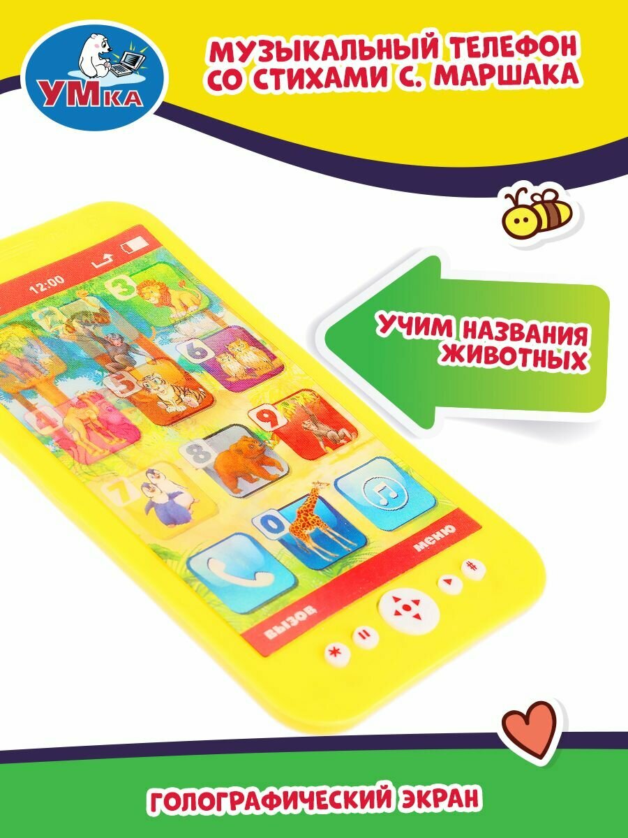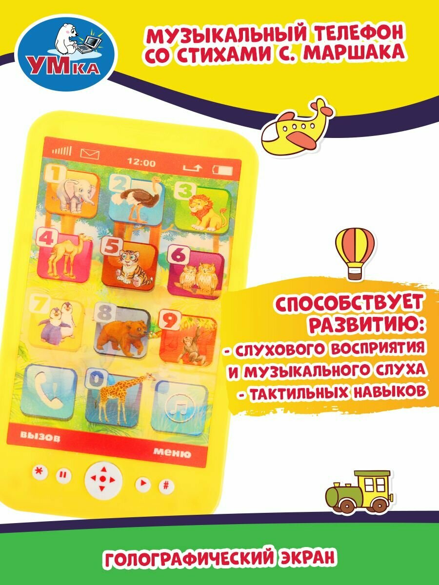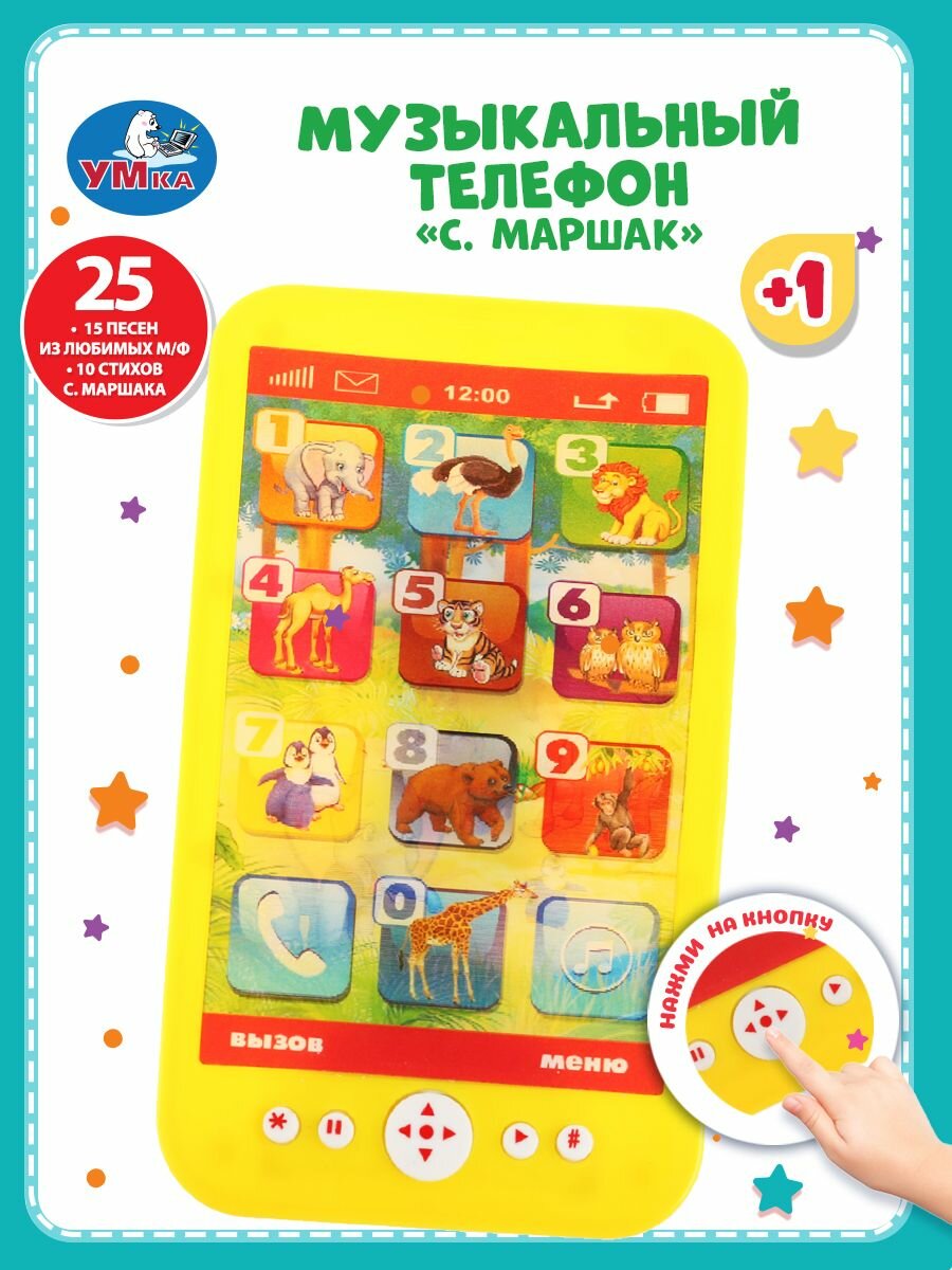 Умка Музыкальный телефон со стихами С. Маршака ТМ УМка станет прекрасным подарком для ребёнка: 10 стихотворений С. Маршака из цикла Детки в клетке. 15 песен из м/ф. Голографический экран. Кнопки Пауза/Воспр. Учим названия животных. Вашего малыша приведёт в восторг эта игрушка в виде яркого телефона. Он с удовольствием будет нажимать на кнопки, слушать замечательные стихотворения Самуила Маршака и весёлые песни из мультфильмов. Благодаря компактному размеру телефон удобно повсюду брать с собой. Музыкальная игрушка ТМ УМка развивает: Мелкую моторику. Пространственное мышление. Внимание. Память. Музыкальный слух. Речь. Размер: 15х8х1 см. Размер упаковки: 25х17х2 см. Материал: пластмасса. Работает от 2-х батареек типа АА в комплекте. Рекомендовано детям от 1 года.